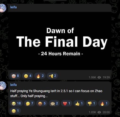 >>546449117That's a very interesting opinion since I can go to the leak channels I follow, scroll up, and see the text that says >Ye Shunguang (in chink runes) [two crossed swords]>Zhao (in chink runes) [shield}