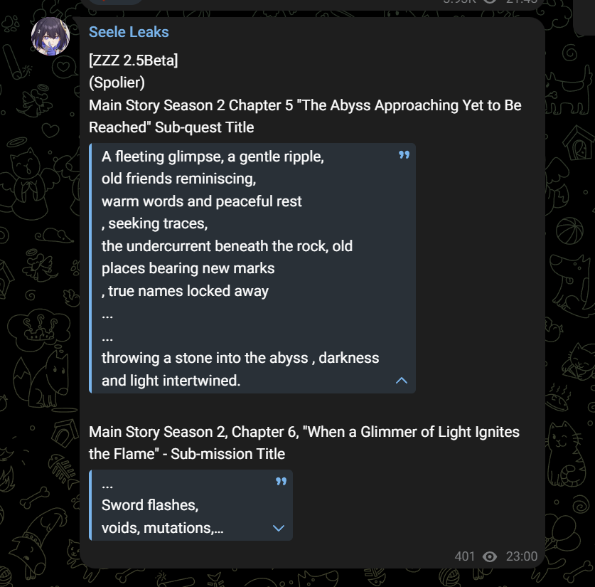 Previous: >>546415974>NewsVersion 2.4 Special Program live on November 14 at 19:30 (UTC+8).Agent Record | Banyuehttps://www.hoyolab.com/article/41700148Agent Record | Dialynhttps://www.hoyolab.com/article/41681910Version 2.3 Special Programhttps://youtu.be/uTWIK77TcdI>Newest Trailer/Teaser/Character demohttps://youtu.be/_Zo_zbHmOpI (EN)https://youtu.be/begsPfi50BY (JP)https://youtu.be/G-dkyslN_4s (EN)https://youtu.be/ovdNs4GBg9o (JP)https://youtu.be/NCzUV95VIEIhttps://youtu.be/CQBbCfxIgnY (EN)https://youtu.be/wutoIFoyZGU (JP)>Upcoming Events for 2.3https://zenless.hoyoverse.com/en-us/news/160259All-New Program 10/14 - 11/25The Inverted Night Lantern 10/14 - 11/24When Dreams Remain Unfinished 10/17 - 11/24SNAP! Shining Strike 10/22 - 11/10Timesworn Hills Explorer's Guide 10/14 - 11/26Advanced Bounty: Routine Cleanup 10/29 - 11/03"En-Nah" Into Your Lap 11/05 - 11/25Chronicle of Counseling 11/05 - 11/17141 Eco Art Exhibition 11/12 - 11/24Data Bounty: Combat Simulation 11/19 - 11/24>Redeemable codes (claimable in-game or online)https://zenless.hoyoverse.com/redemptionZENLESSGIFTZZZ23SWEETILY>Resources and useful linkshttps://rentry.org/zzzlinkshttps://rentry.org/ZZZ-Friendshttps://interknot-network.com>/zzz/ OP pastebin (use this if making new thread):https://pastebin.com/PzbMf13P