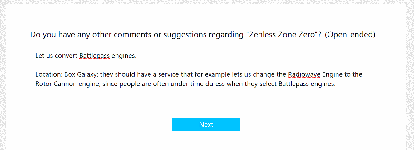 >>546467701Tell them this:We want to be able to convert Battlepasss engines.Location: Box Galaxy, they should have a service there that lets us change the Radiowave Engine to the Rotor Cannon engine, since people are offten under timepress duress when they select BP engines.