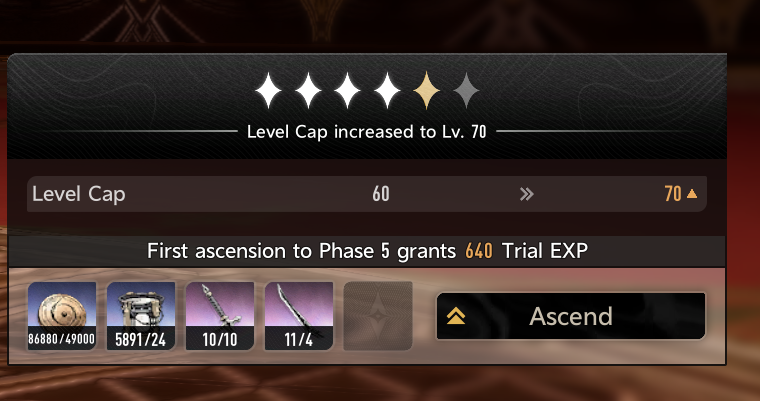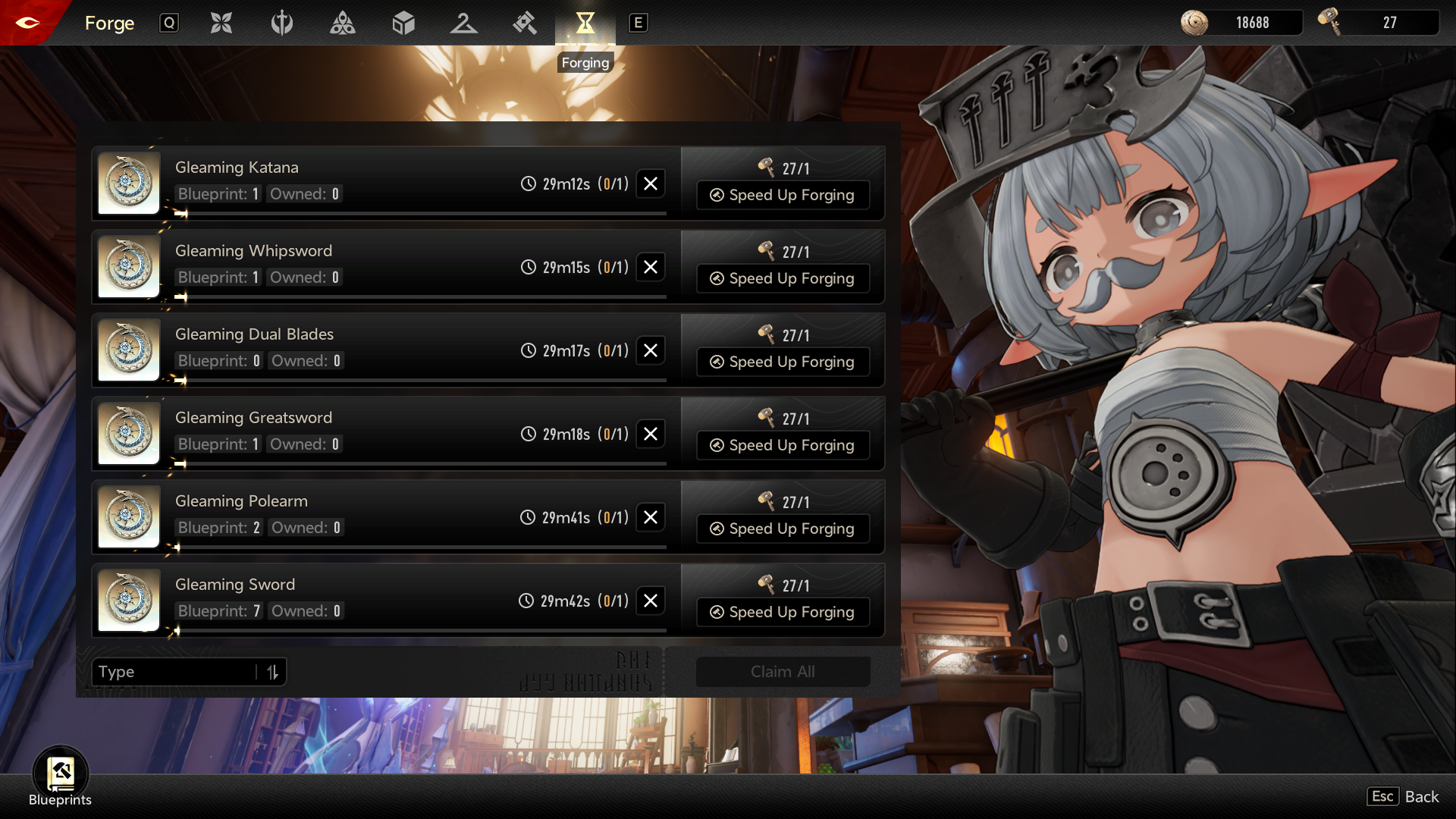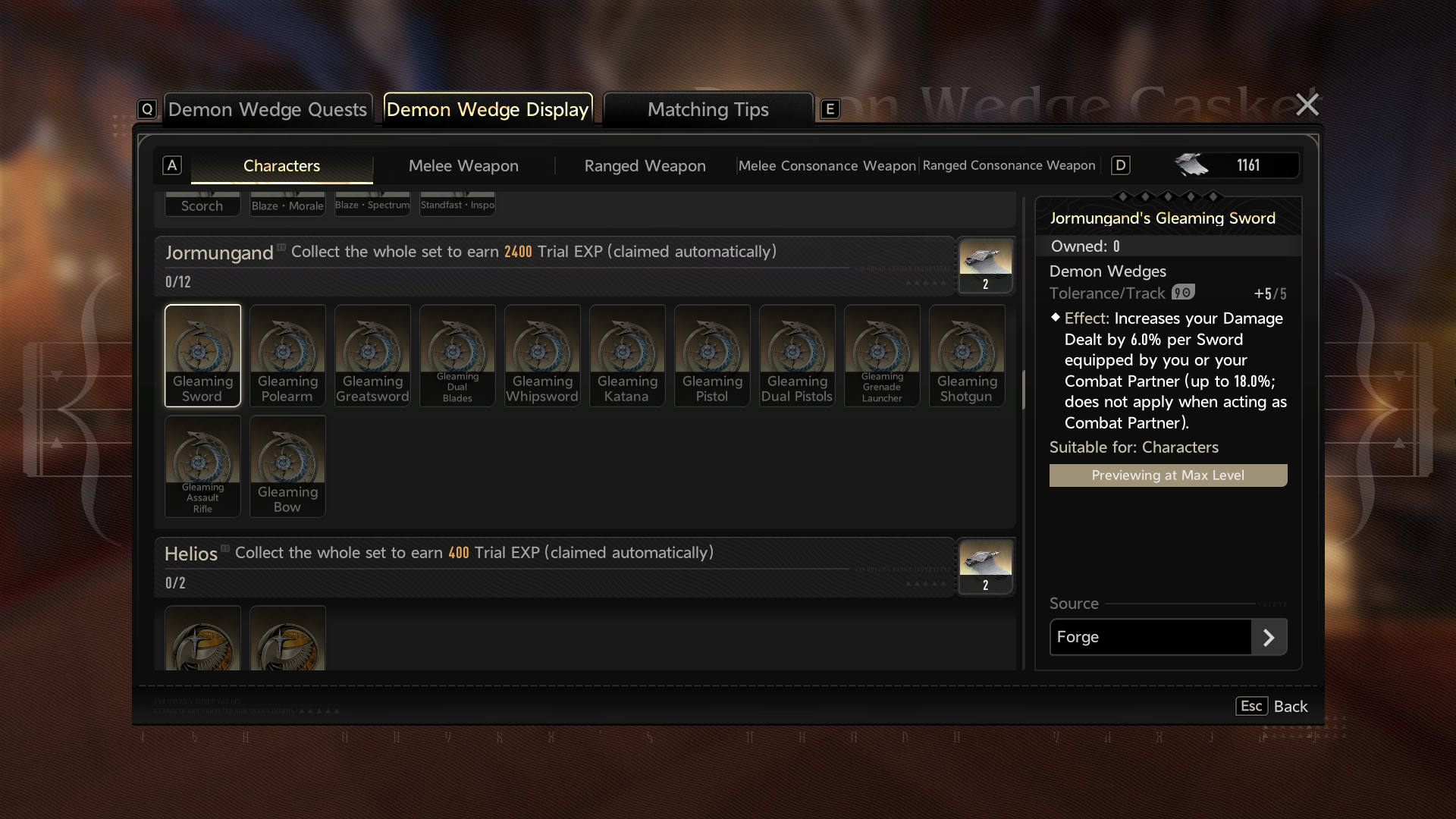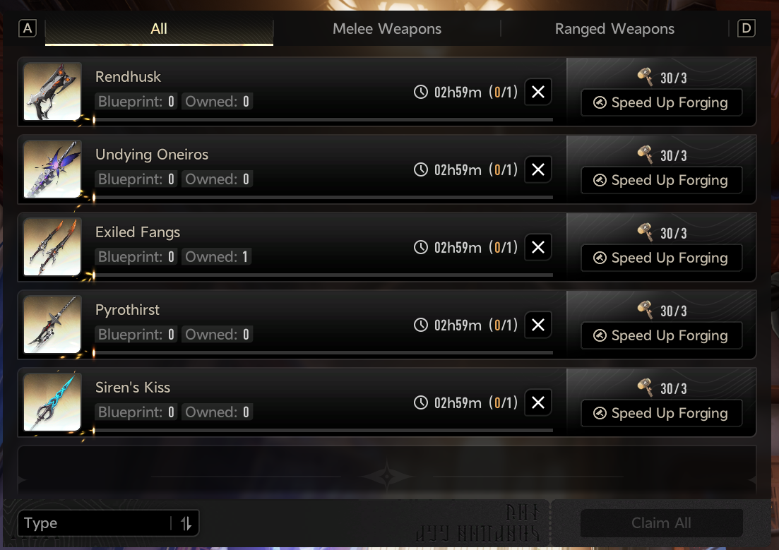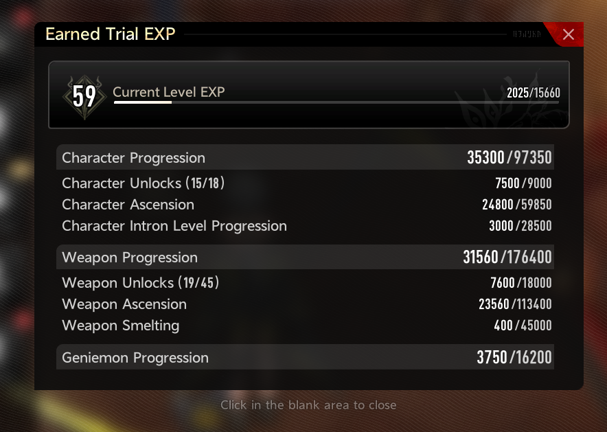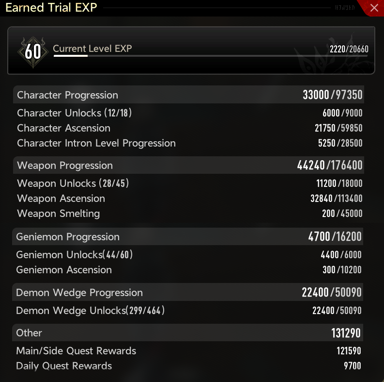 l still need ~22000 of EXP.Each weapon gives 400 + 1240 EXP, so this will gives ~8000 EXP.So I need to forge an additional 12 weapons.Good lord.