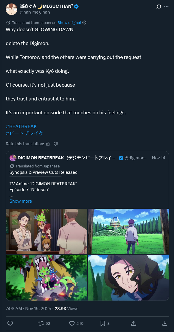 >Preview: "Kyo, you can't leave me...to make breakfast" "Yoou'll be fine, lol">Actual episode: Kyo basically drains himself to keep his secret Digimon baby shelter alive, while BlackGaogamon gets abandoned and nearly starved to death by the yakuza for having morals.I guess if Beatbreak has some beach episode tier preview where Makoto and Reina just talk about having fun at the shore, someone from the main cast fucking dies.