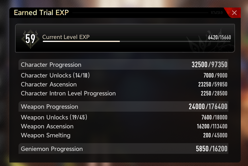 >>546588076Intron is a flat 250 exp each new one, getting a character and ascending them gives you more faster, wedge collection is fast as well and doesn't use your resources (the claim button on wedge set is for the clues, exp is given on mission reward screen).Weapon crafting is cancer comparatively and almost required for Trial rank 55 to 60.https://docs.google.com/spreadsheets/d/1VzI3_SYUeJjPhDj6sixx8LJcIT4EF7hrWm947kOWuqc/preview>>546588439If it is for sigil support yeah it is better them, thought you wanted a gun to use.>>546588797When you trigger spike status (symbol near damage numbers) it does 1.5x damage per tutorial, some anon said this wedge would buff the 1.5 to 1.9 but i haven't seen anybody test it yet.