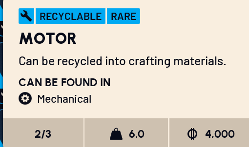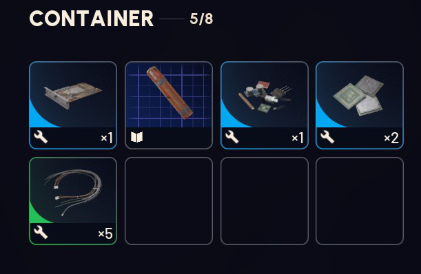 >>546582171Industrial sections of the maps (or mechanical, I can't remember). Also, and this is helpful in general, but having a good idea of blue items that you can recycle in raid for the component you're looking for is nice so you can maximize your backpack efficiency. Things like spring cushions and cooling coils recycle into springs.