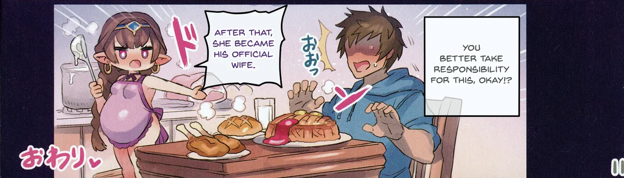 >>546582396Here is a translation of the text in the comic panel.Right Box (Narration)Japanese: その後 めっちゃいい 正妻ポジに なったRomaji: Sono ato, meccha ii seisai poji ni natta.English: "After that, she settled into the position of an amazing official wife."Man (Center)Japanese: おおっRomaji: Oo~English: "Whoa!"Girl (Left Speech Bubble)Japanese: ホラ できた わよ!!Romaji: Hora! Dekita wa yo!!English: "Look! It's all done!!"Sound Effect (Next to girl)Japanese: ドッRomaji: Do!!English: THUD! (This is a sound effect, likely of her presenting the food emphatically.)Bottom Left CornerJapanese: おわりRomaji: Owari English: "The End "