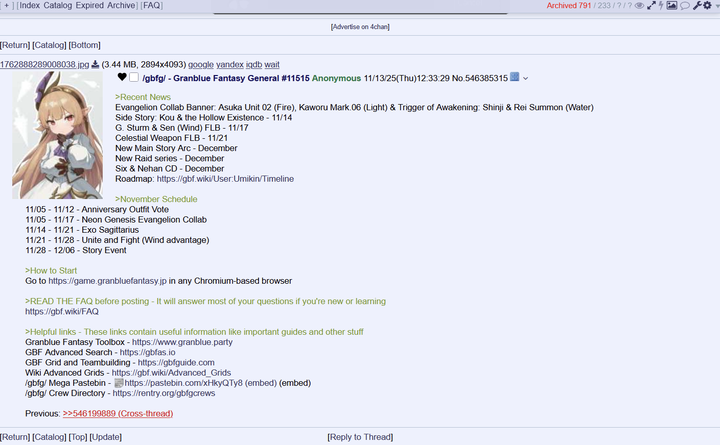 >Recent NewsEvangelion Collab Banner: Asuka Unit 02 (Fire), Kaworu Mark.06 (Light) & Trigger of Awakening: Shinji & Rei Summon (Water)Side Story: Kou & the Hollow Existence - 11/14G. Sturm & Sen (Wind) FLB - 11/17Celestial Weapon FLB - 11/21New Main Story Arc - DecemberNew Raid series - DecemberSix & Nehan CD - DecemberRoadmap: https://gbf.wiki/User:Umikin/Timeline>November Schedule11/05 - 11/12 - Anniversary Outfit Vote11/05 - 11/17 - Neon Genesis Evangelion Collab11/14 - 11/21 - Exo Sagittarius11/21 - 11/28 - Unite and Fight (Wind advantage)11/28 - 12/06 - Story Event>How to StartGo to https://game.granbluefantasy.jp in any Chromium-based browser>READ THE FAQ before posting - It will answer most of your questions if you're new or learninghttps://gbf.wiki/FAQ>Helpful links - These links contain useful information like important guides and other stuffGranblue Fantasy Toolbox - https://www.granblue.partyGBF Advanced Search - https://gbfas.ioGBF Grid and Teambuilding - https://gbfguide.comWiki Advanced Grids - https://gbf.wiki/Advanced_Grids/gbfg/ Mega Pastebin - https://pastebin.com/xHkyQTy8 (embed)/gbfg/ Crew Directory - https://rentry.org/gbfgcrewsPrevious: >>546385315