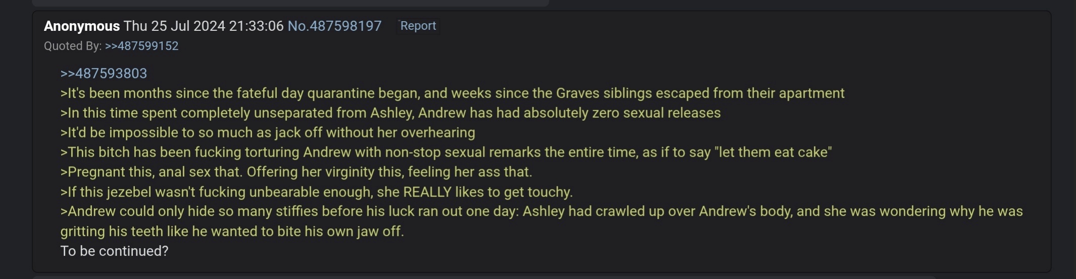 Sometimes I remember like 3 words from a reen that resonated with me a year ago and I come back to it in the archives. This one was one of many for example. Can the anon that wrote this please stand up. Continue your green. I probably remember this one only because it says "anal sex" ONCE...