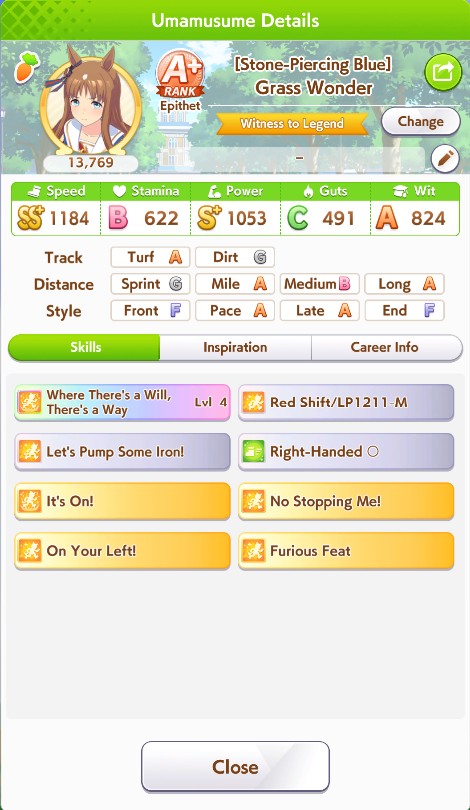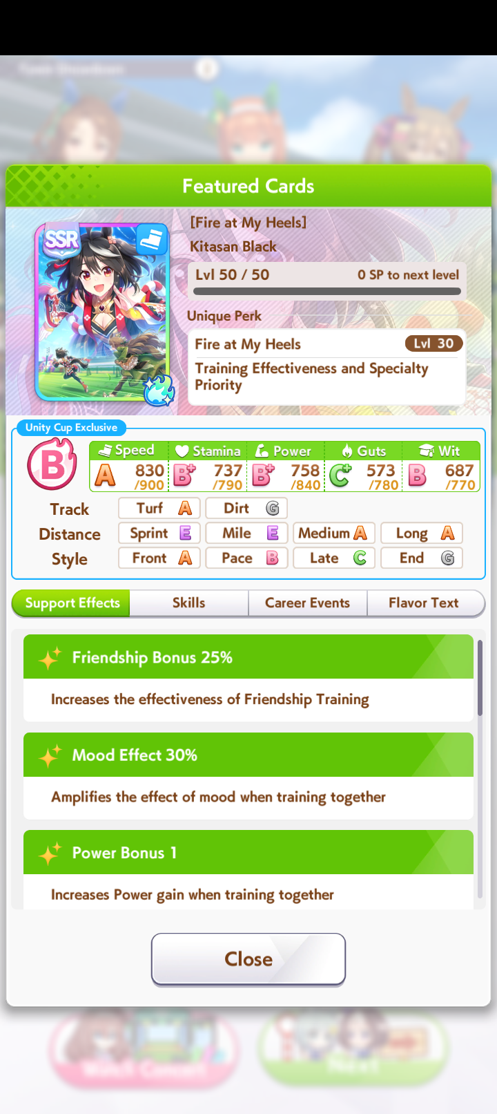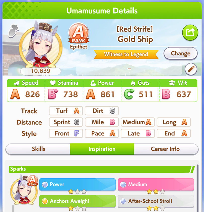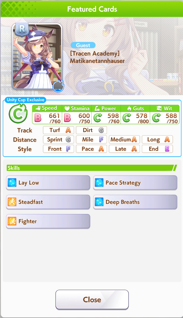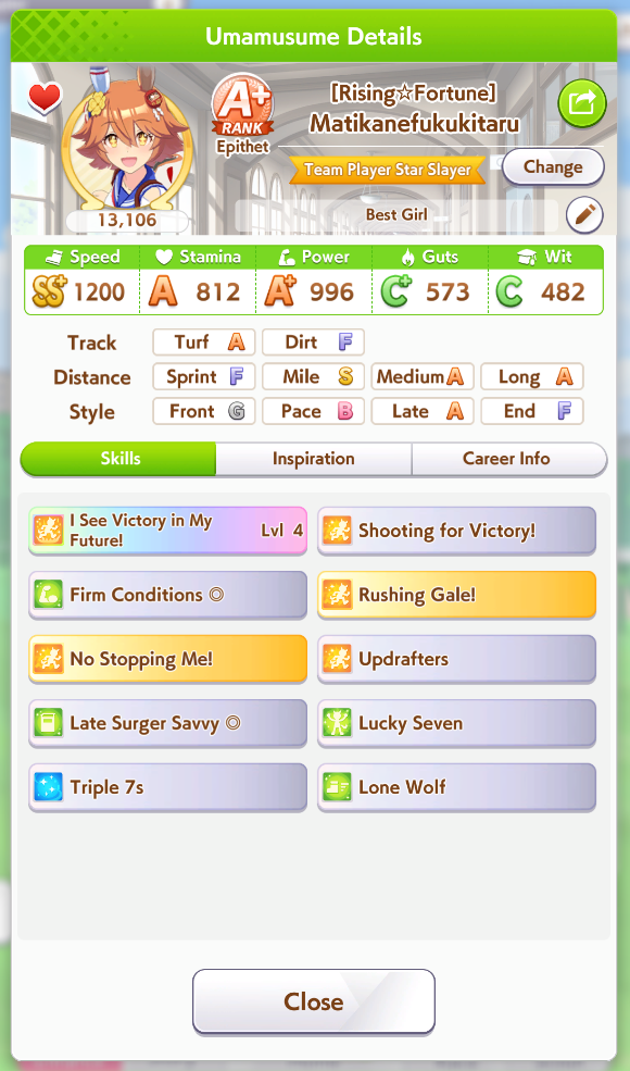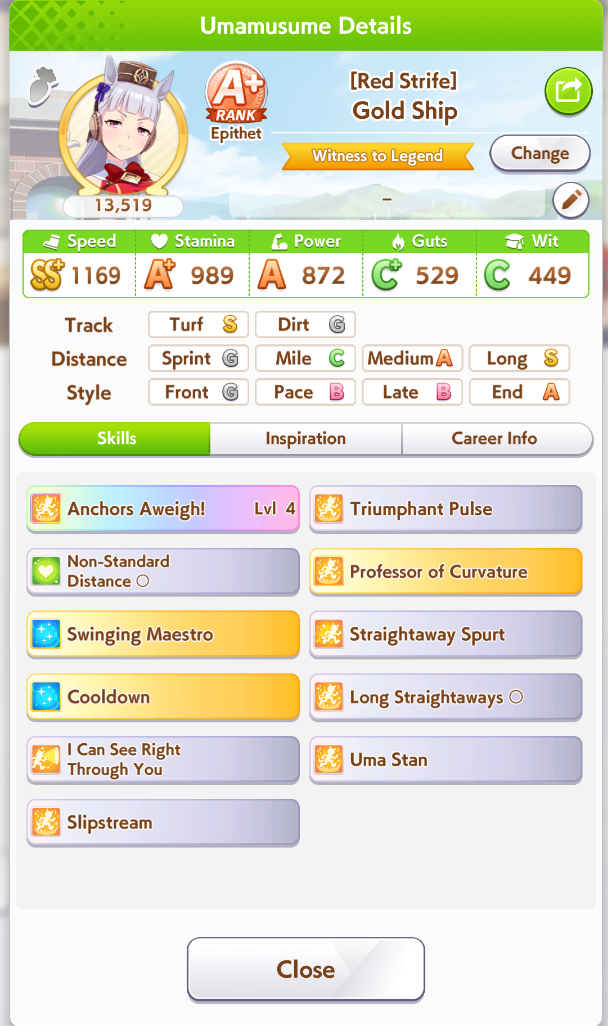 Fantasy Pasa spooked me while pulling for Bono- is she as viable for this CM as she seems? Late Surgers seem at the moment to be if not on-meta then at least very usable thanks to the accelerated QoL stuff, and she gets two very nice golds for this race on a +15% speed buff.I'm getting a little sick of Seiun ace runs, to be honest, even with the dumb falcon groundwork guarantee.