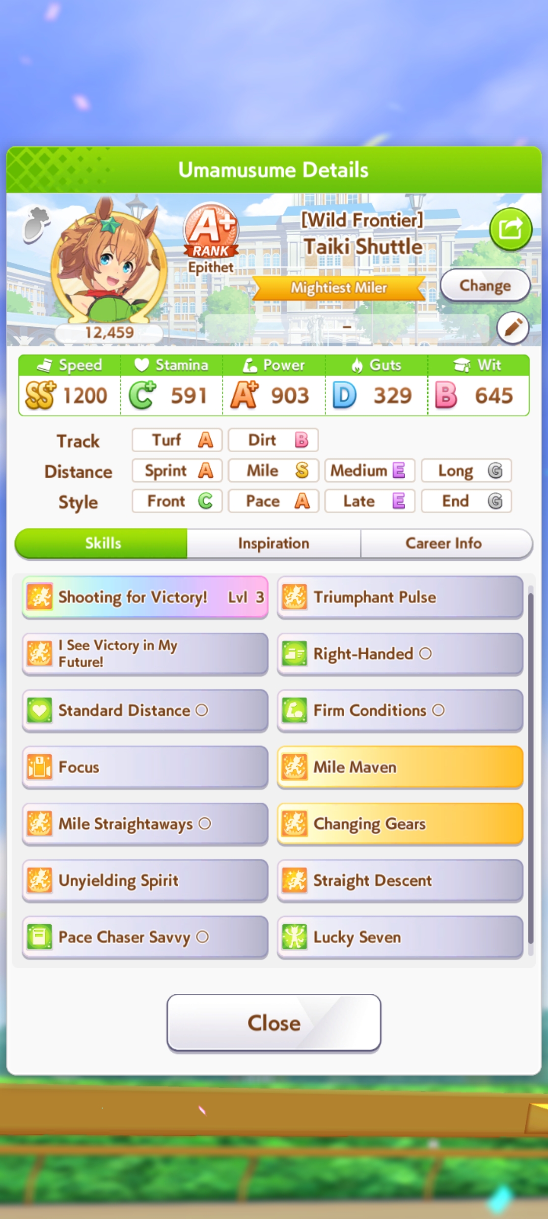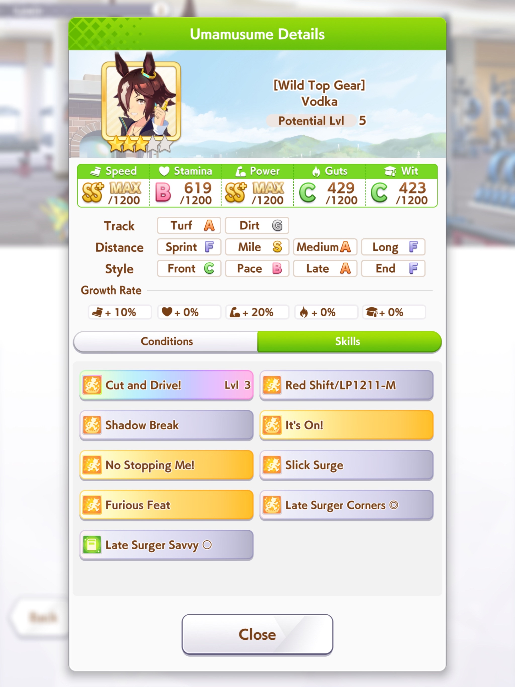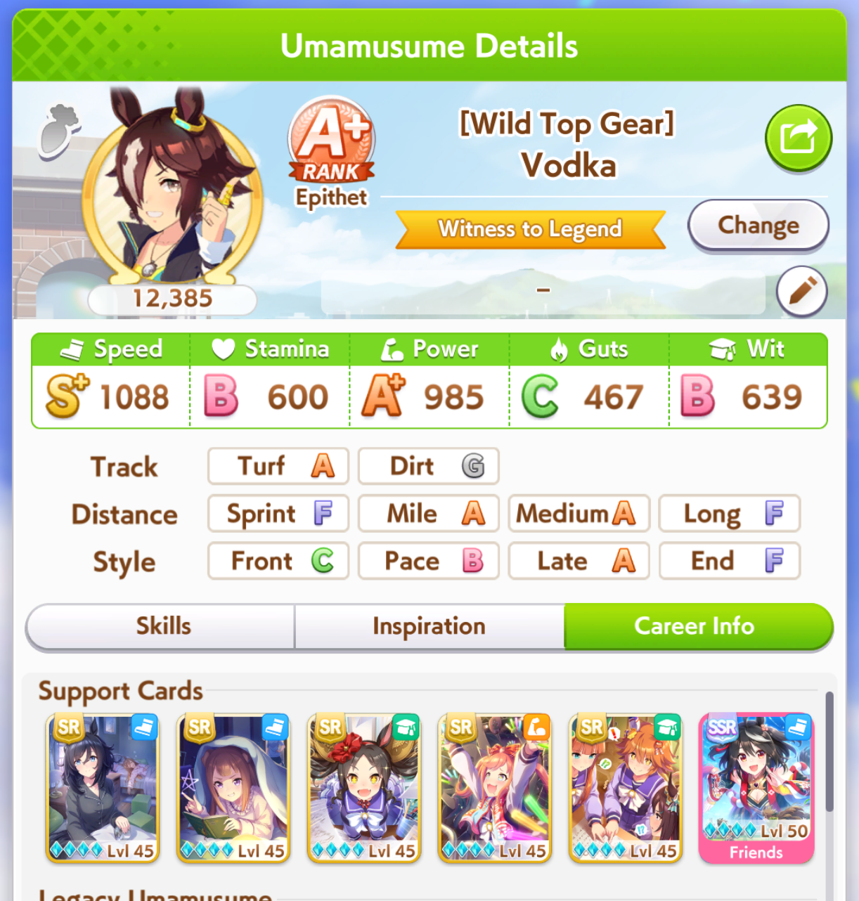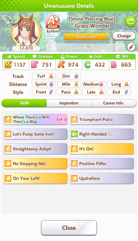 Fantasy Pasa spooked me while pulling for Bono- is she as viable for this CM as she seems? Late Surgers seem at the moment to be if not on-meta then at least very usable thanks to the accelerated QoL stuff, and she gets two very nice golds for this race on a +15% speed buff.I'm getting a little sick of Seiun ace runs, to be honest, even with the dumb falcon groundwork guarantee.