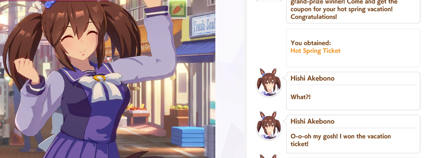 Previous: >>546691840>Global Game NewsCurrent Scenario: Aoharu Hai aka "Unity Cup"Current Specials Missions: Half Anniversary Part 2+3Current Rate Up: Hishi Akebono (3*) Matikanefukukitaru (3* Alt), Biko Pegasus (SSR), Sakura Bakushin O (SSR), Riko Kashimoto (SSR), Rice Shower (SSR)11/11 - Balance Adjustments AKA Umamusume 2https://umamusume.com/news/100040/https://pages.snep.pw/uma/anni-skill-changes/11/13 - Legend Races11/16 - VIRGO CUP - Hanshin 1600m11/24 - Story event>JP Game NewsCurrent Rate Up: Wonder Acute alt (3*), SSR Mihono Bourbon (Power)New Scenario "Yukoma Hot Spring" releasedTimeline: https://uma.moe/timeline>IP NewsUmamusume Cinderella Gray 2nd season started weekly airings on 10/5>Thread Clubshttps://rentry.co/umaglobalclublistYou must be E3 (20k points) to join a circle. Apply with /uma/ or /vg/ in your profile or post ID in the thread.>All Guides & Resourceshttps://rentry.org/uma26Game databasehttps://gametora.com/umamusume (Click the gear to switch between JP / global server info)A basic guide for newfagshttps://rentry.org/umaglobalFind networks if your region is blocked from the game or clienthttps://www.umavpn.top/93Seiyuu & Concertshttps://rentry.org/umst