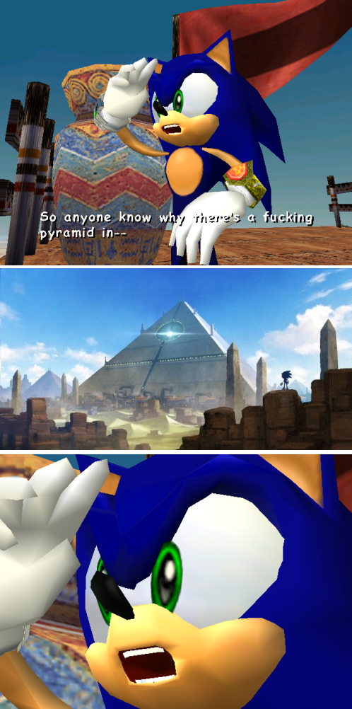 >>546714306I love all the egypt theming in SA2 as well.I think it's a result of the game being developed on constrained hardware, development resources, or both. SA2 only has a handful of envrionments/atmospheres that get reused across levels, but it gives the game a strong identity and makes everything feel pretty cohesive.