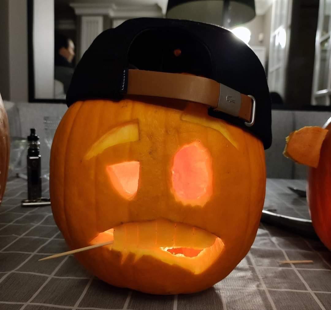 krack in an oversized orange sweater and brown pants