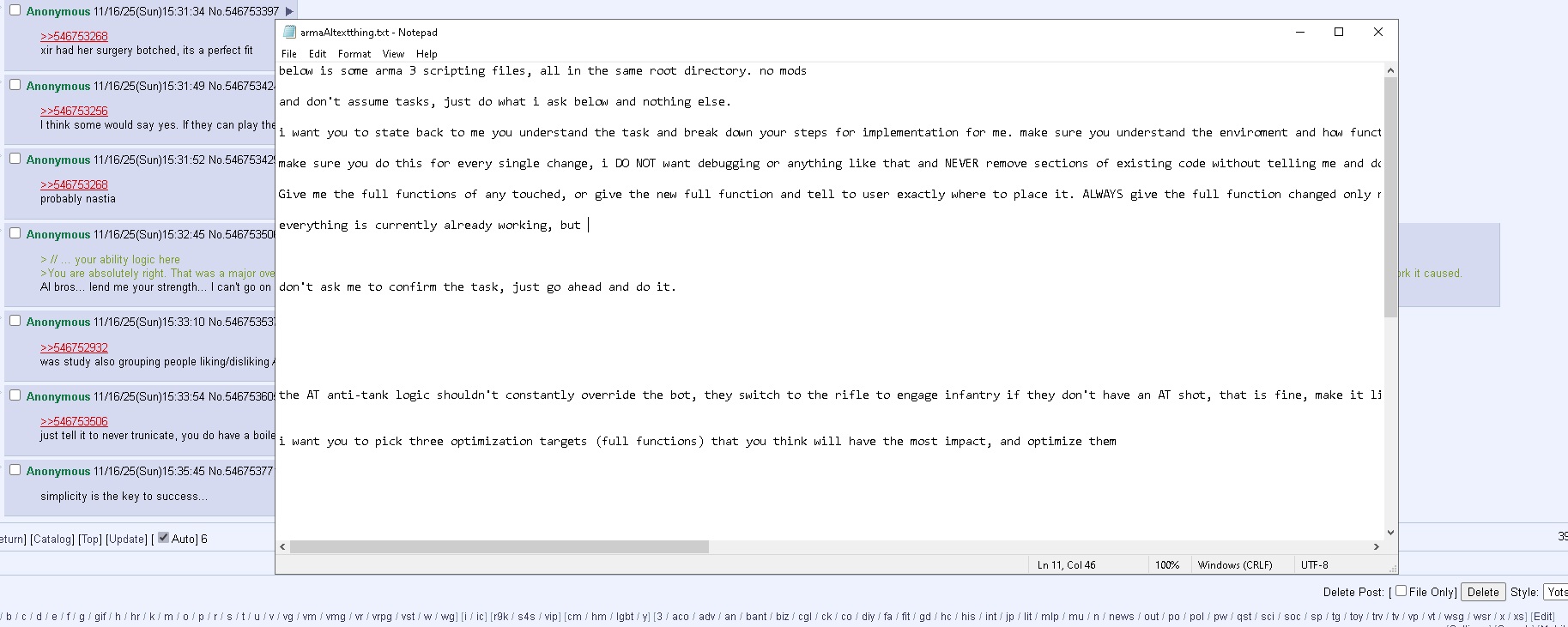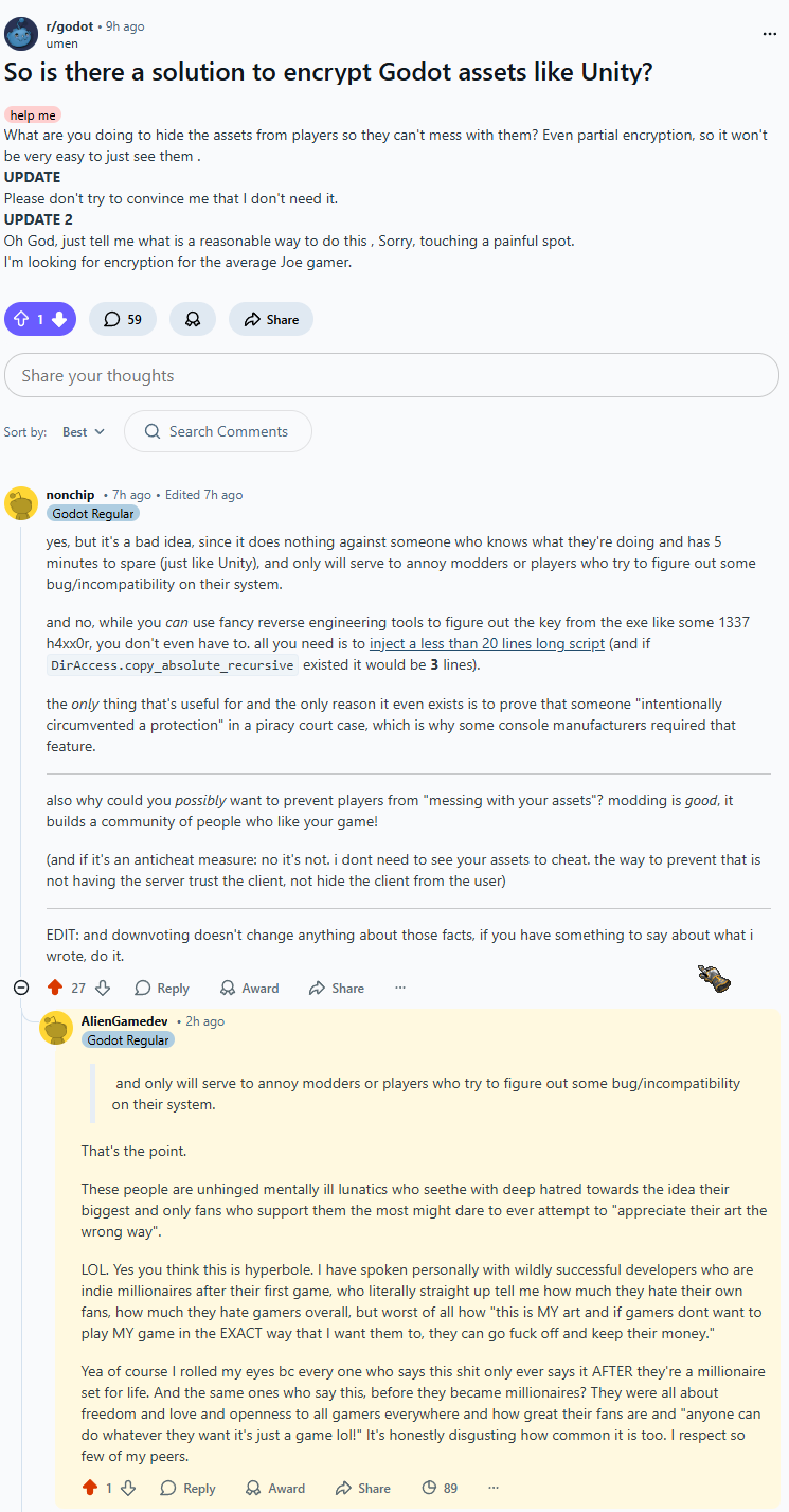 >>546756047>show me your game made with AI that managed to recoup your initial investment. 300 bucks per month is insane and I feel sorry to any vibecoder that thinks he'll be able to produce and sell games using that tool.i don't pay for AI, also it's a mod and it's in the OP>>546756254his argument is sound though, he's basically saying library of babel shit about how if it's said by a human it means something, if you found detailed instructions on how to build a working fusion reactor is it the library or the person discovering it (using it)