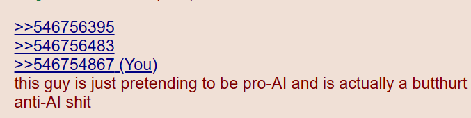 >>546756395>>546756483>>546754867this guy is just pretending to be pro-AI and is actually a butthurt tranny that spams the same AI shit over and over so he feels justified in shitting up the thread with anti-AI shit
