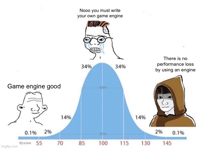 >>546750875I actually grind my own flour from wheat I buy.And yes I have chickens.eggs prices are actually cheap as fuck where I'm from but I really like animals and it's so much fun to raise chickens and learn about them.I'm actually in the process of clearing a few trees so that I can make a mushroom grow patch, and have more space to grow flowers so I can eventually support bees.But I'm not an engine dev, I feel like this analogy is bad cause I actually have a garden and it's very easy to get way too much food in one season, and chickens literally just shit out eggs. That guy is going to have so much flour and eggs he might be eating cake for the rest of his life. But knowing how to grow wheat and raise chickens doesn't have anything to do with knowing how to make a cake. But making an engine does have a connection to making games. I think the better analogy would me like the guy making his own batter and recipe versus like a guy buying just add water box batter and like some basic stuff like cheap frosting and sprinkles.The skilled baker or cake artist will take years to really become excellent.