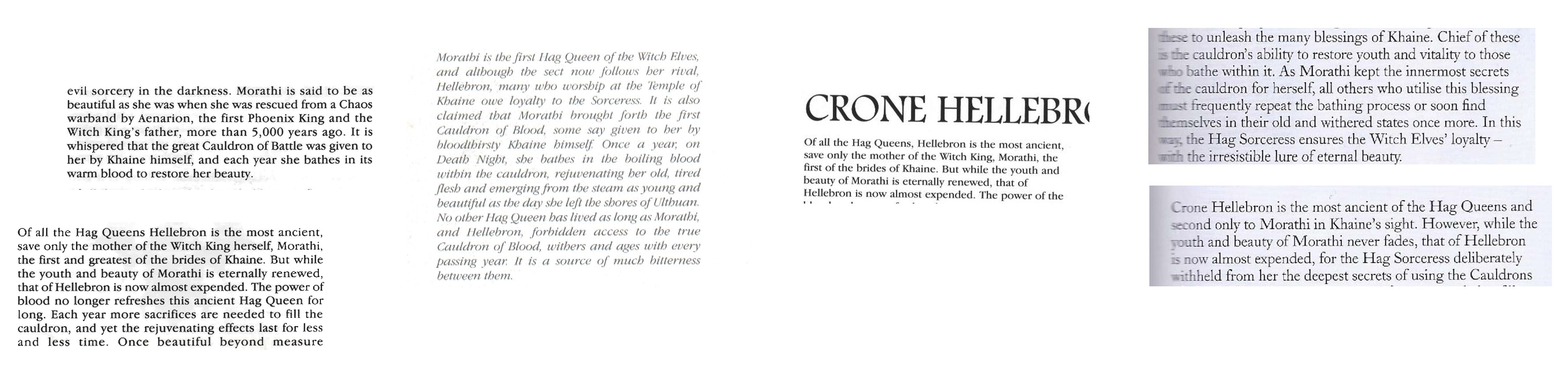 >>546920301The thing about Hellebron's cauldron and probably all the other no-name Hag Queens if they lived long enough is she need more blood each year and the rejuvenating effect lasts for a shorter time each year (she doesn't even stay young for a whole year anymore).Morathi probably doesn't have this problem with her own cauldron.