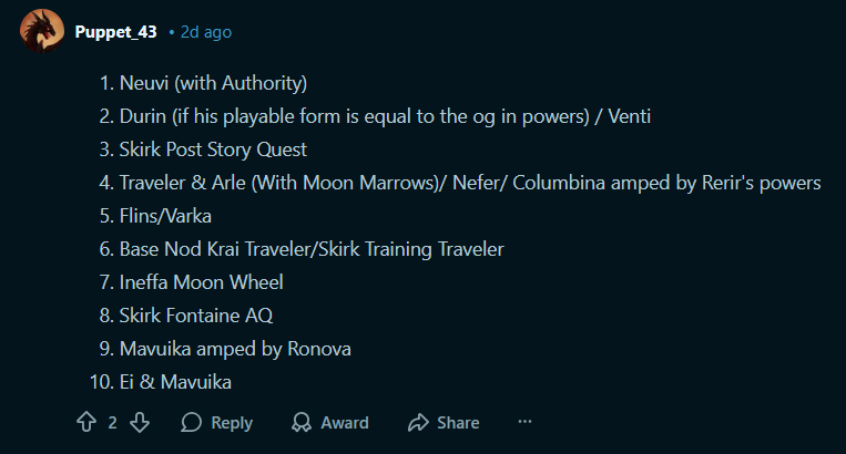 Strongest playable characters in lore:1. Neuvi (with Authority)2. Durin (if his playable form is equal to the og in powers) / Venti3. Skirk Post Story Quest4. Traveler & Arle (With Moon Marrows)/ Nefer/ Columbina amped by Rerir's powers5. Flins/Varka6. Base Nod Krai Traveler/Skirk Training Traveler7. Ineffa Moon Wheel8. Skirk Fontaine AQ9. Mavuika amped by Ronova10. Ei & Mavuika