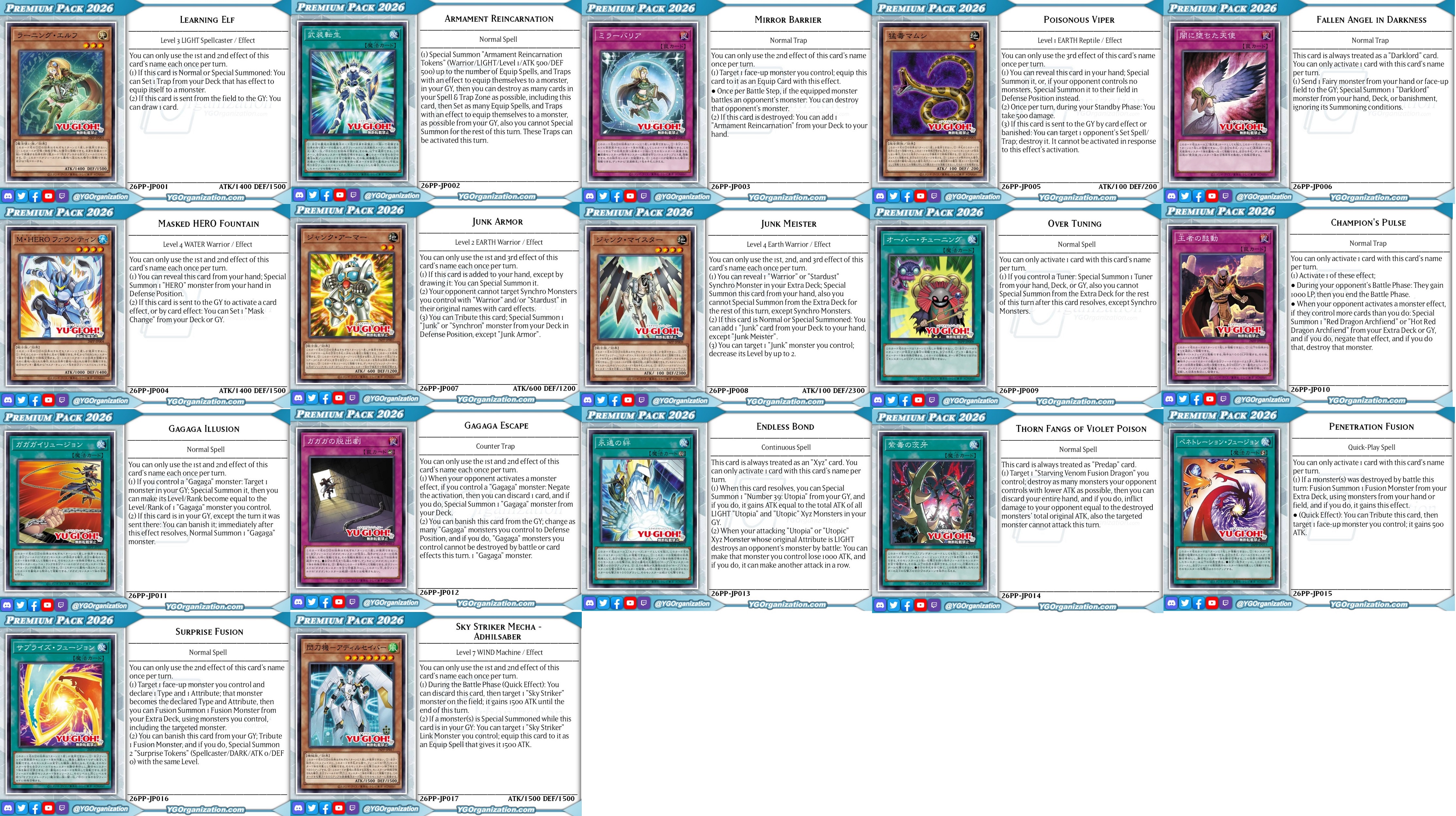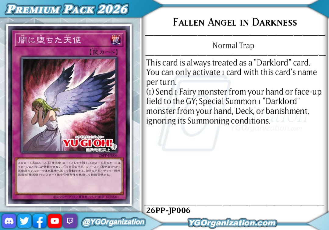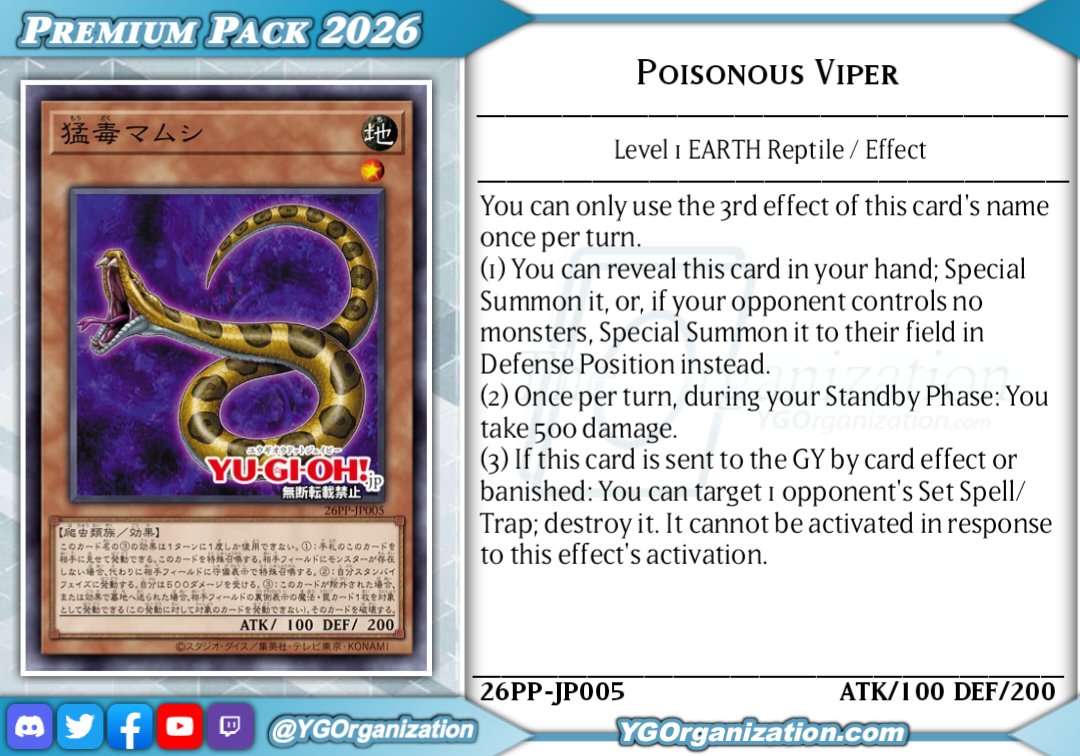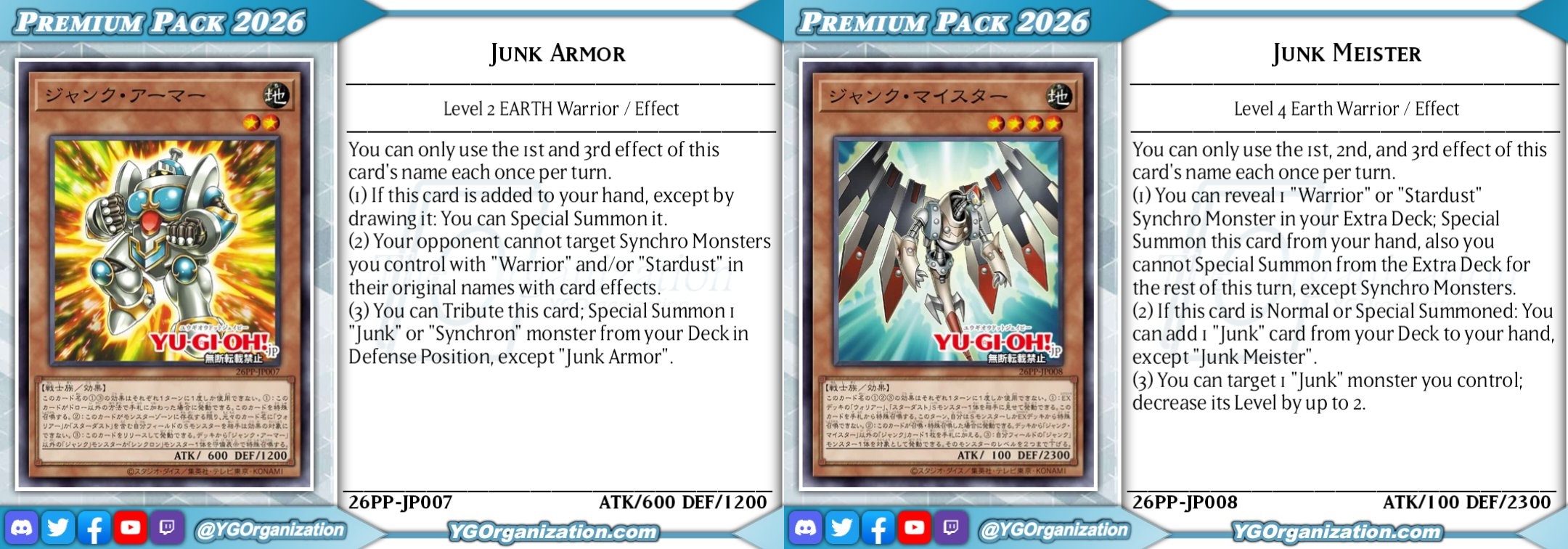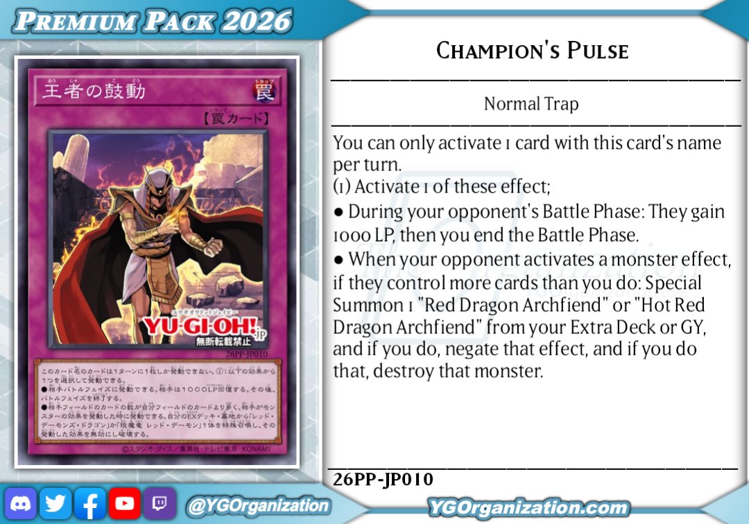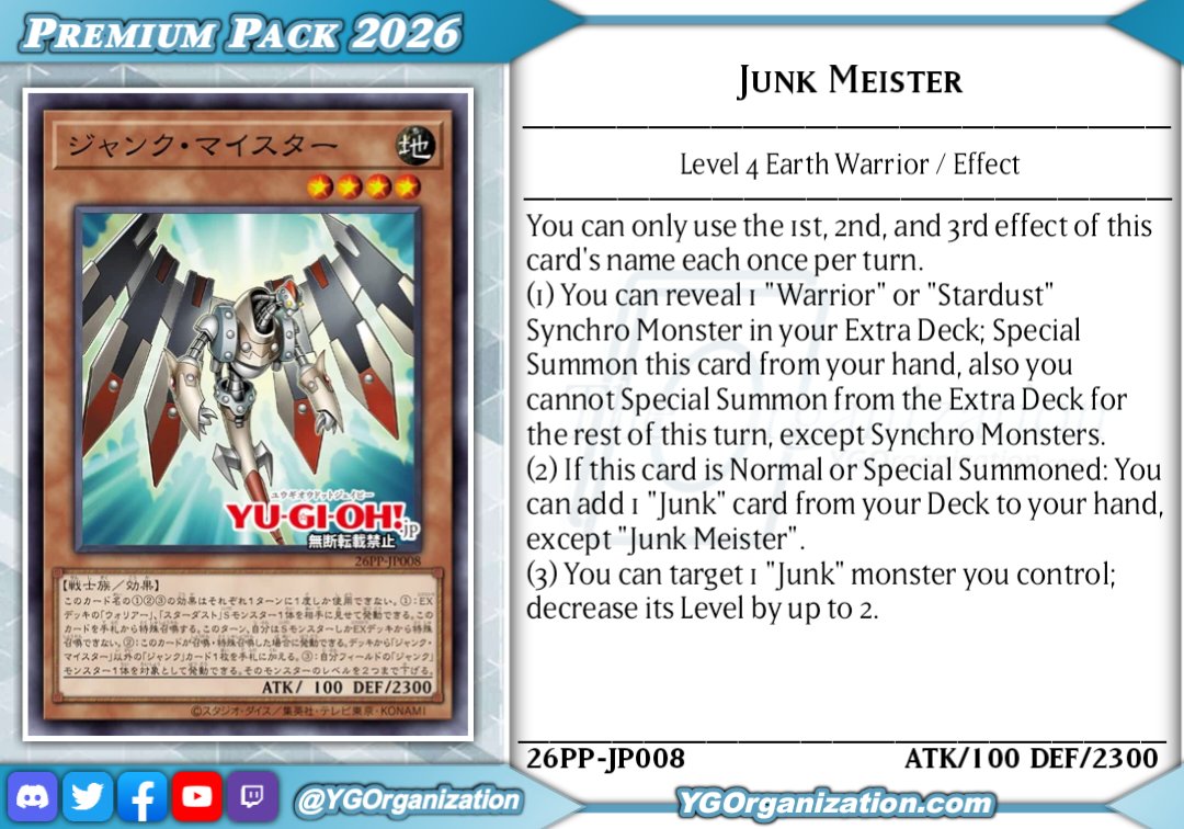 #6665 - Junk editionPrevious: >>546705347>SimulatorsAutomated:●EDOPro (PC/Android): https://projectignis.github.io/download.html●Master Duel (Multi-plat): https://store.steampowered.com/app/1449850Manual:●Duelingbook (online): https://www.duelingbook.comTag: “/dng/” Password: “vidya”; on EDOPro, specify server.Genesys Duels: MR5, TCG, Custom Rules: No Links/Pend/EMZ/Pend Zones>LinksRulebook: https://www.yugioh-card.com/en/rulebook/Wiki: https://yugipedia.comProbability Calculator: https://yugioh.fyiStock Market: https://yugiohprices.comDatabase: https://www.db.yugioh-card.comMisc Info: https://www.formatlibrary.comBlog:https://yugiohblog.konami.com/Alt Format:https://www.yugioh-card.com/en/genesys/>BanlistsTCG: https://www.yugioh-card.com/eu/play/forbidden-and-limited-list/ (Oct 27/Next List: TBA)OCG: https://yu-gi-oh.jp/news_detail.php?page=details&id=2341 (Oct 1/Next List: Jan 1)>DecklistsOCG: https://roadoftheking.com https://tonamel.com/competitions?game=yugioh_ocgTCG: https://ygoprodeck.com/category/decks/tournament-meta-decks>NewsJP: https://yugioh-starlight.comEN: https://ygorganization.com>Upcoming SetsOCG:●Terminal World 3 (Nov 22)●Premium Pack 2026 (Dec 20)●DUELIST BOX -Prismatic Summon- (Dec 20)●THE CHRONICLES DECK - Charmer (Jan 24)●Blazing Dominion (Jan 24)●LIMIT OVER COLLECTION -THE PROTAGONISTS- (Feb 28)●LIMIT OVER COLLECTION -THE RIVALS- (Mar 20)TCG:●Legendary 5Ds Deck (Nov 21)●Phantom Revenge (Dec 4)●Burst Protocol (Jan 23)●THE CHRONICLES DECK - Spirit Charmers (Jan 23)●Maze of Muertos (Feb 20)●Legendary Modern Decks 2026 (Mar 13)>Events●/dng/ Friday Night Tourney 3: TBA●/dng/ League S1 (Week 11, Nov 9-Nov 16):https://challonge.com/dngleagueseason1