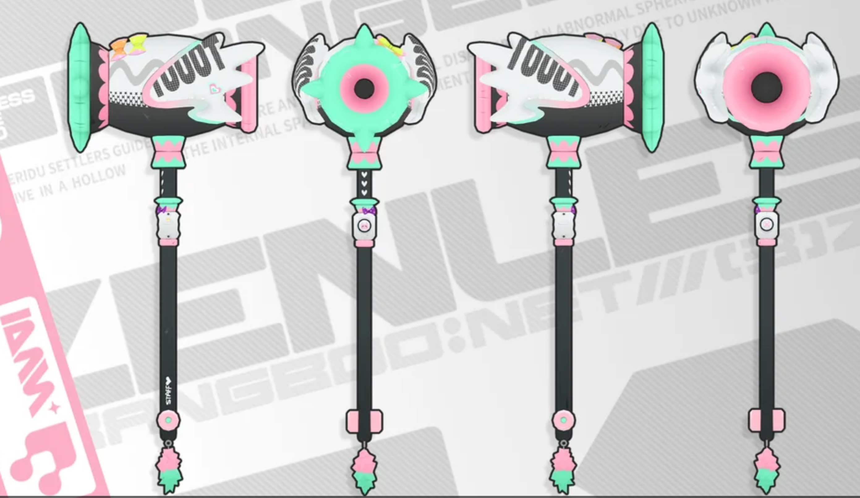 > Found these in the files for 2.5. They may have been in the files in 2.4, not sure. Some cool things I found along with this though. She has a little Nokia phone. It also has bones for every button for some reason, so each button can be animated individually. Also, her big hammer is a little charge on her backpack. Not sure if its significant, but this charm is listed as a weapon. Perhaps her hammer grows from the little charge into a big hammer (speculation). Also, I included a shaded version of the little guy. It should look something like what you see here.>Also, to be clear, the megaphone still exists I just didn't include it since it's not new.From the plebbit post by the leaker. Microphone is apparently still in the files he just didn't post it? I don't know.