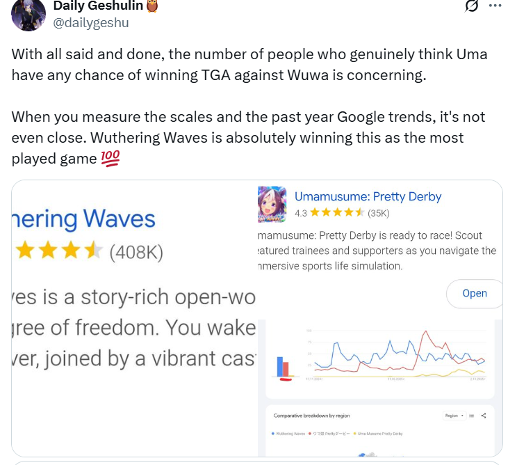 So any chance will win the mobile game award, or will we be mogged by Uma musume.