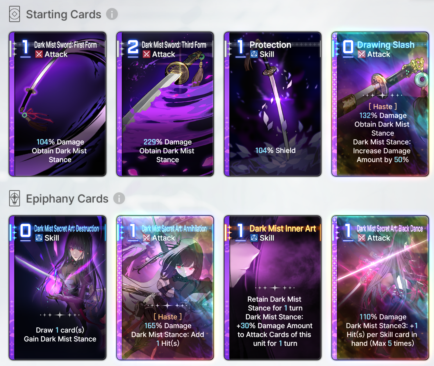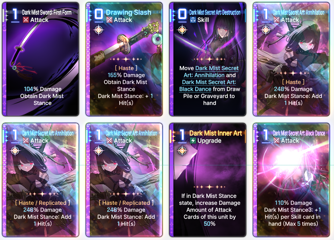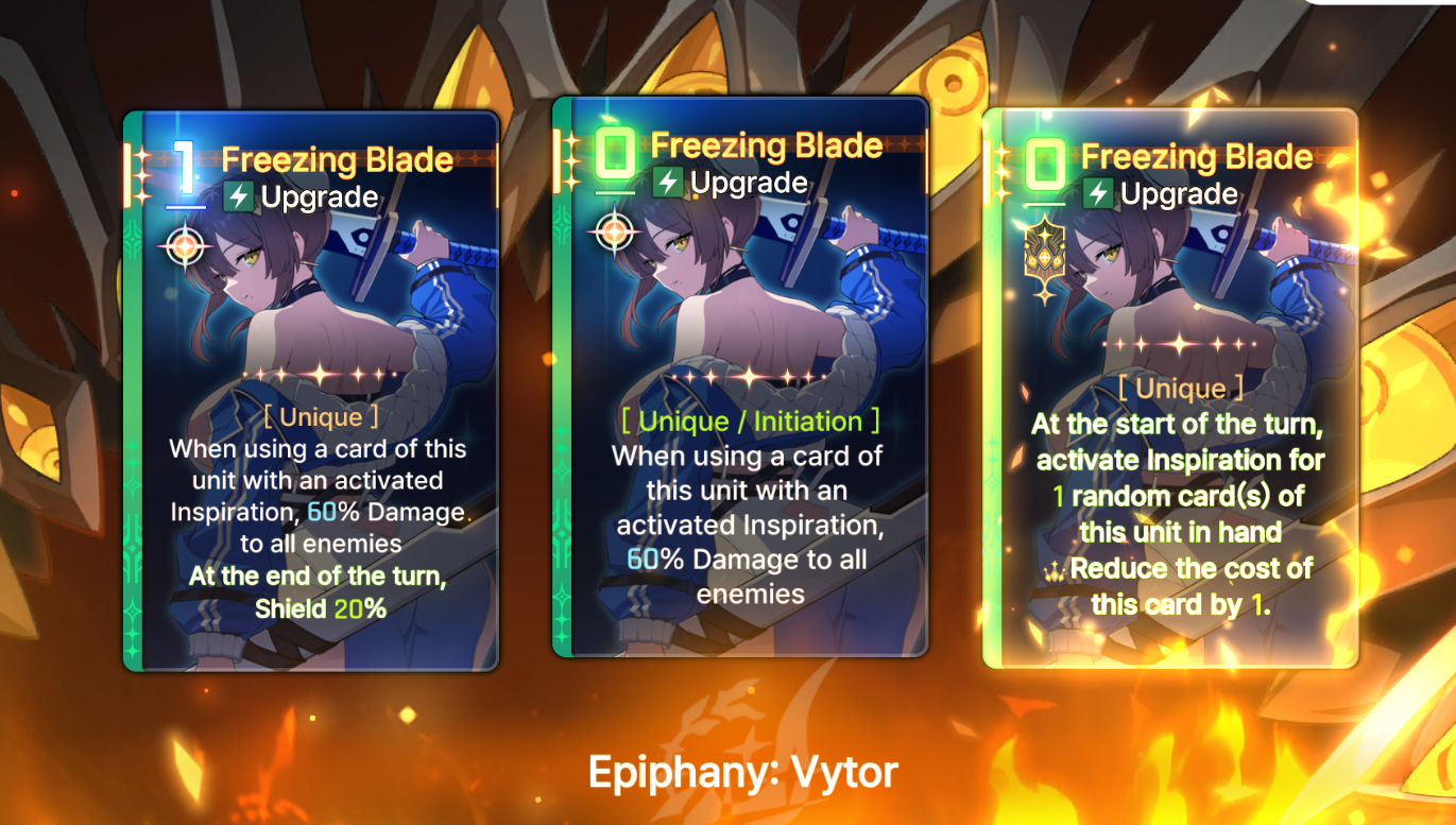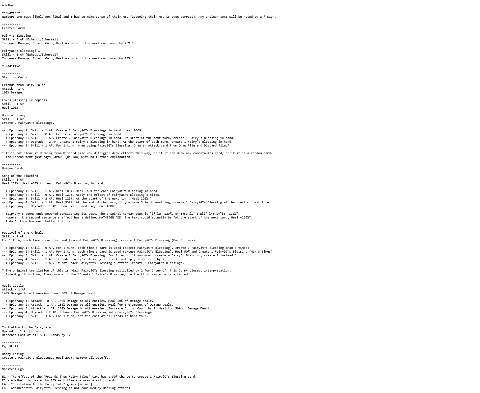 Discuss now!Adelheid***Note***Numbers are most likely not final and I had to make sense of their MTL (assuming their MTL is even correct). Any unclear text will be noted by a * sign.----------Created Cards----------Fairy's BlessingSkill - 0 AP [Exhaust/Ethereal]Increase Damage, Shield Gain, Heal Amounts of the next card used by 25%.*Fairy’s Blessing★Skill - 0 AP [Exhaust/Ethereal]Increase Damage, Shield Gain, Heal Amounts of the next card used by 25%.** Additive.----------Starting Cards----------Friends from Fairy TalesAttack - 1 AP 100% Damage.Fox's Blessing (2 copies)Skill - 1 APHeal 100%.Hopeful StorySkill - 1 APCreate 2 Fairy’s Blessings.--> Epiphany 1: Skill - 1 AP. Create 2 Fairy’s Blessings in hand. Heal 100%.--> Epiphany 2: Skill - 0 AP. Create 2 Fairy’s Blessings in hand.--> Epiphany 3: Skill - 1 AP. Create 2 Fairy’s Blessings in hand. At start of the next turn, create 1 Fairy's Blessing in hand.--> Epiphany 4: Upgrade - 2 AP. Create 1 Fairy's Blessing in hand. At the start of each turn, create 1 Fairy's Blessing in hand.--> Epiphany 5: Skill - 1 AP. For 1 turn, when using Fairy’s Blessing, Draw an Attack card from Draw Pile and Discard Pile.** It is not clear if drawing from Discard pile would trigger draw effects this way, or if it can draw any combatant's card, or if it is a random card.