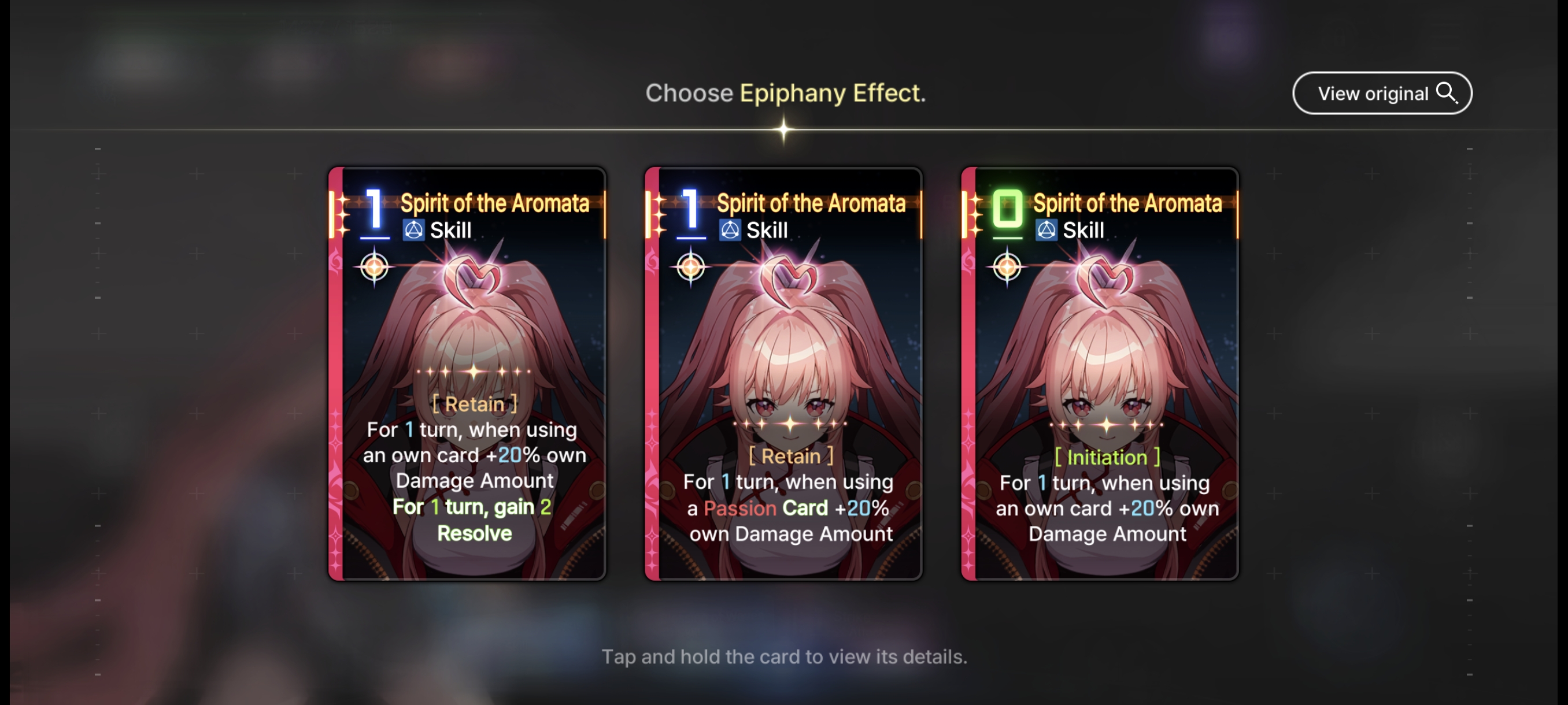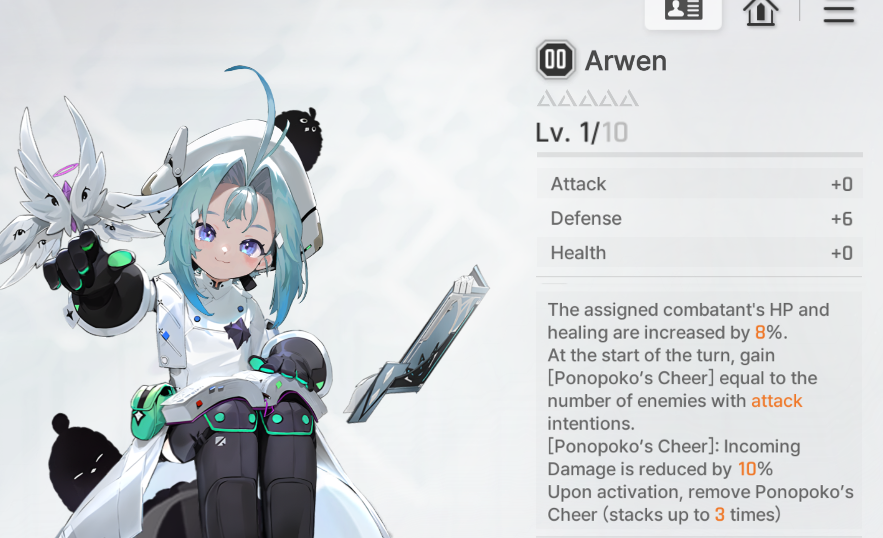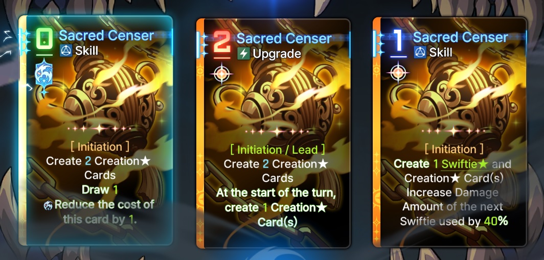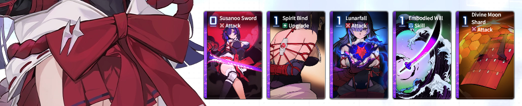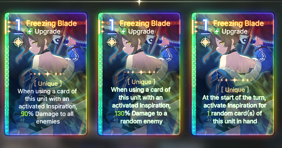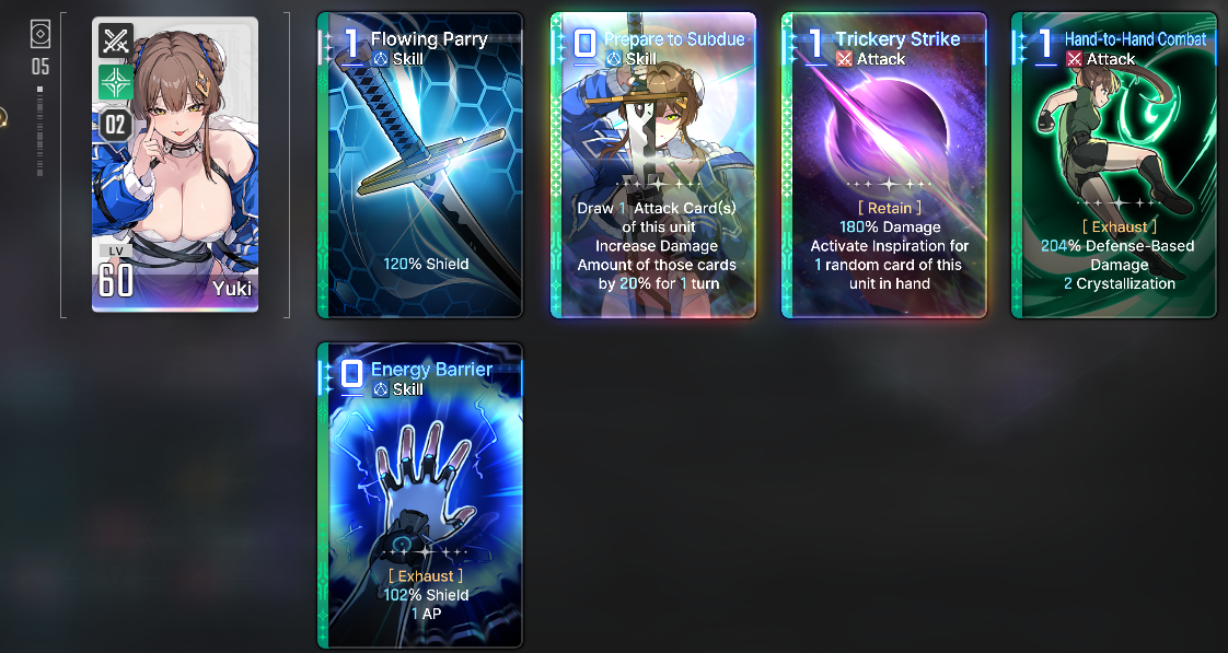 Discuss now!Adelheid***Note***Numbers are most likely not final and I had to make sense of their MTL (assuming their MTL is even correct). Any unclear text will be noted by a * sign.----------Created Cards----------Fairy's BlessingSkill - 0 AP [Exhaust/Ethereal]Increase Damage, Shield Gain, Heal Amounts of the next card used by 25%.*Fairy’s Blessing★Skill - 0 AP [Exhaust/Ethereal]Increase Damage, Shield Gain, Heal Amounts of the next card used by 25%.** Additive.----------Starting Cards----------Friends from Fairy TalesAttack - 1 AP 100% Damage.Fox's Blessing (2 copies)Skill - 1 APHeal 100%.Hopeful StorySkill - 1 APCreate 2 Fairy’s Blessings.--> Epiphany 1: Skill - 1 AP. Create 2 Fairy’s Blessings in hand. Heal 100%.--> Epiphany 2: Skill - 0 AP. Create 2 Fairy’s Blessings in hand.--> Epiphany 3: Skill - 1 AP. Create 2 Fairy’s Blessings in hand. At start of the next turn, create 1 Fairy's Blessing in hand.--> Epiphany 4: Upgrade - 2 AP. Create 1 Fairy's Blessing in hand. At the start of each turn, create 1 Fairy's Blessing in hand.--> Epiphany 5: Skill - 1 AP. For 1 turn, when using Fairy’s Blessing, Draw an Attack card from Draw Pile and Discard Pile.** It is not clear if drawing from Discard pile would trigger draw effects this way, or if it can draw any combatant's card, or if it is a random card.