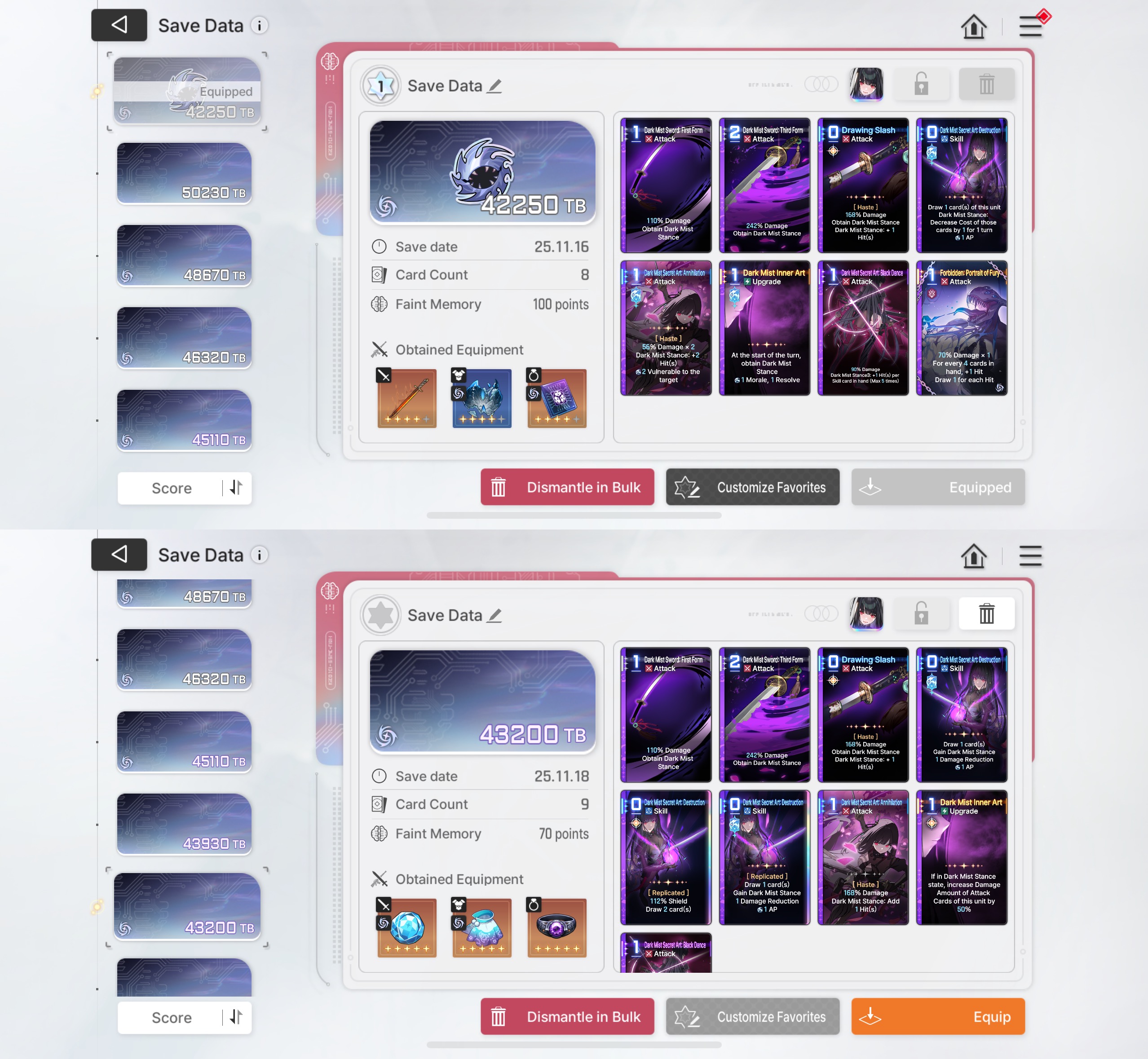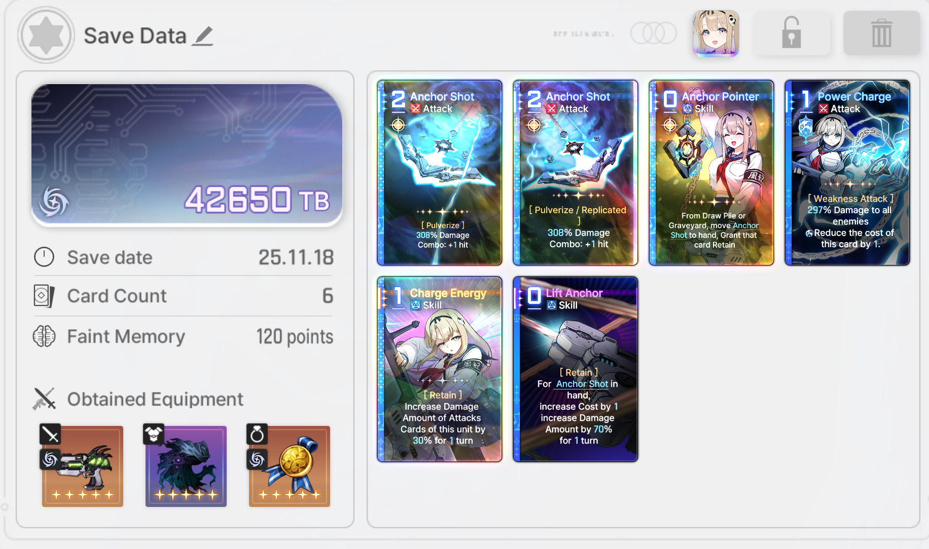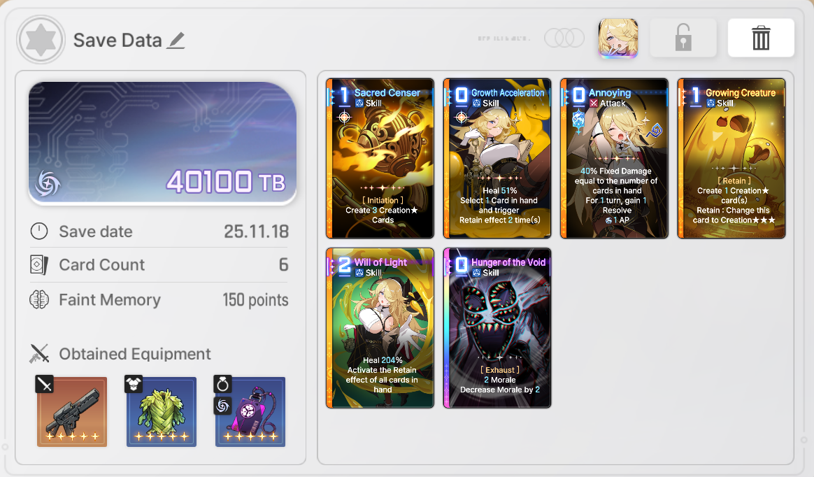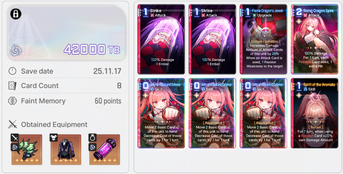 >>546997167This was my best deck a while ago. She's feelt good "enough" but still can't reach the insane output damage people are getting.Of course she's been good enough to massively help clear up to level 8 basin last season. 9 and 10 were impossible, but that may be underleveled/undergeared issue.You seem knowledgable, how would you improve it? More copies of destruction with god epiphanies? Of course the rest of the cards with divine epiphanies would also help, as well as the best gear.What's you recommended equipment lodout? I mean the 3 gears you get during the run, not the memory fragments.