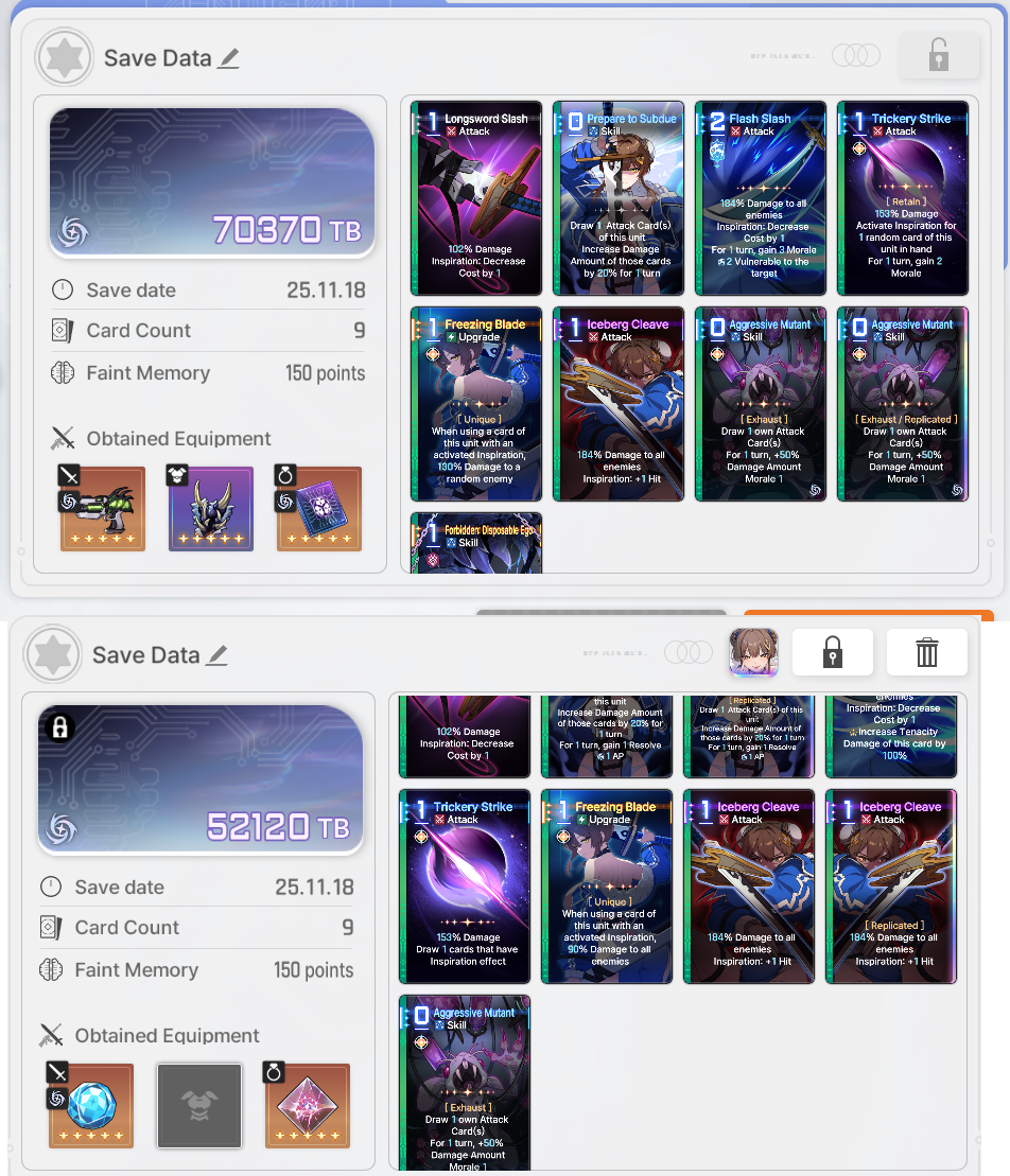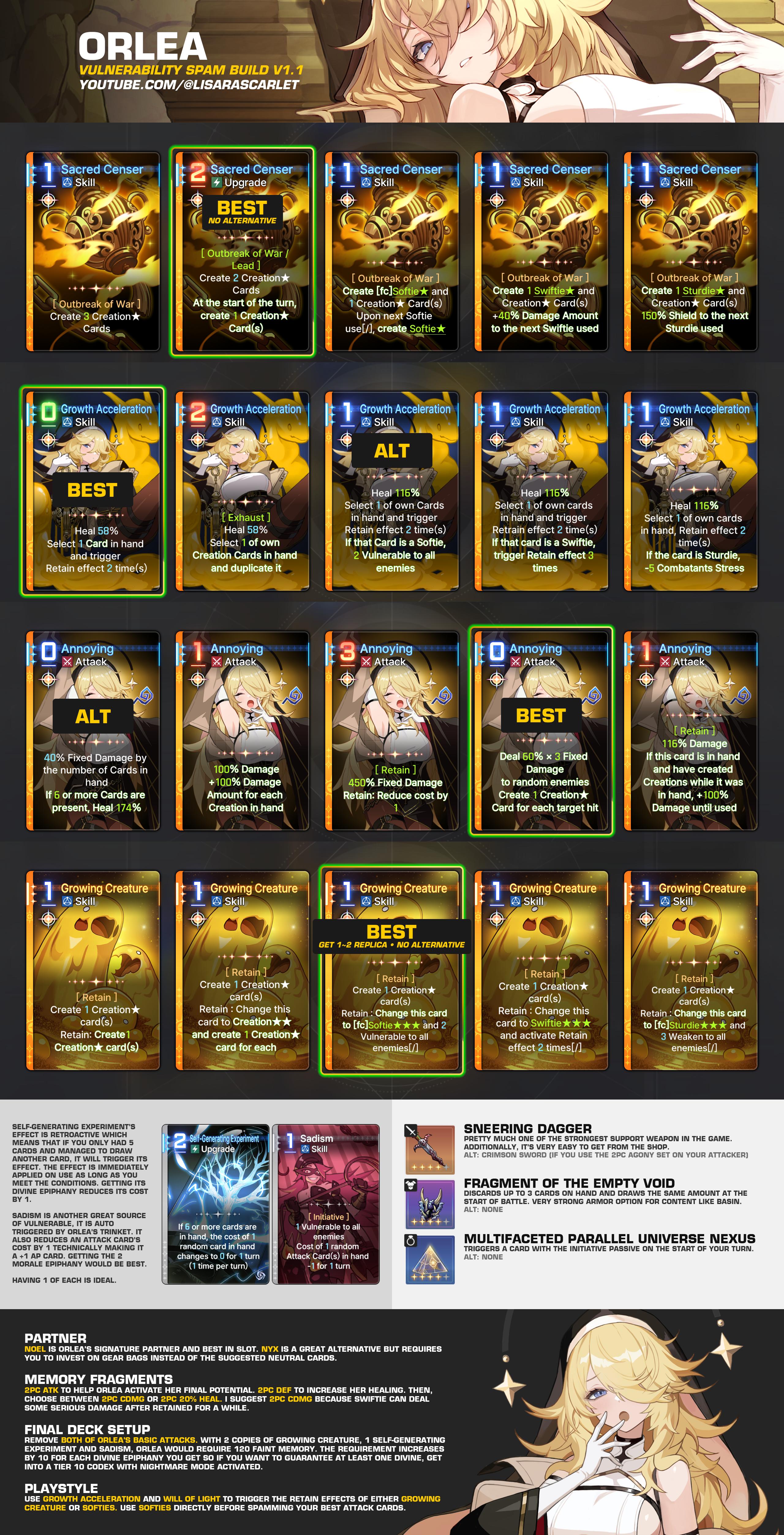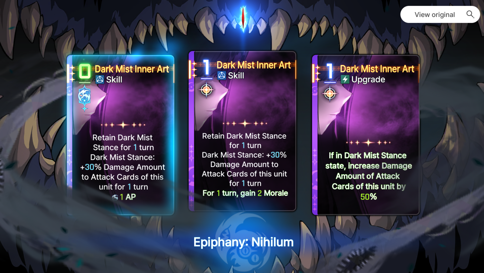 >>546992747Drawing is the best with +1 or if it has vuln/morale, depending on what you're stacking.Destruction is the best with move and ideally +1 ap.Annihilation is weird case, 4-hit one is very good with morale, 2x hit is good with vuln, and I feel like crit one might be very good too if you're approaching 80% crit rate.Inner art is 50% upgrade, worst case the 0-cost one.If you miss any of the good upgrades, she'll feel like shit outside of chaos, and even with all good-perfect epiphanies, without +1 ap on destruction, she'll be slow unless you have insane Mika deck to feed her all the ap she needs.