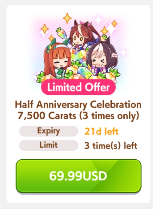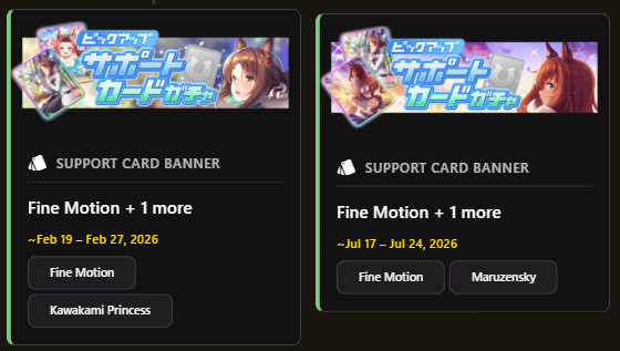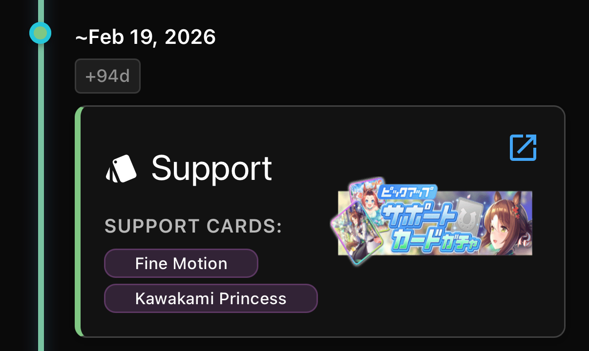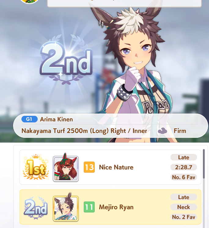 Previous: >>546968206>Global Game NewsCurrent Scenario: Aoharu Hai aka "Unity Cup"Current Specials Missions: Half Anniversary Part 2+3Current Rate Up: Hishi Akebono (3*) Matikanefukukitaru (3* Alt), Biko Pegasus (SSR), Sakura Bakushin O (SSR), Riko Kashimoto (SSR), Rice Shower (SSR)https://umamusume.com/news/100040/https://pages.snep.pw/uma/anni-skill-changes/11/13 - Legend Races11/16 - VIRGO CUP - Hanshin 1600m11/24 - Story event>JP Game NewsCurrent Rate Up: Wonder Acute alt (3*), SSR Mihono Bourbon (Power)New Scenario "Yukoma Hot Spring" releasedTimeline: https://uma.moe/timeline>IP NewsUmamusume Cinderella Gray 2nd season started weekly airings on 10/5>Thread Clubshttps://rentry.co/umaglobalclublistYou must be E3 (20k points) to join a circle. Apply with /uma/ or /vg/ in your profile or post ID in the thread.>All Guides & Resourceshttps://rentry.org/uma26Game databasehttps://gametora.com/umamusume (Click the gear to switch between JP / global server info)A basic guide for newfagshttps://rentry.org/umaglobalFind networks if your region is blocked from the game or clienthttps://www.umavpn.top/93Seiyuu & Concertshttps://rentry.org/umst