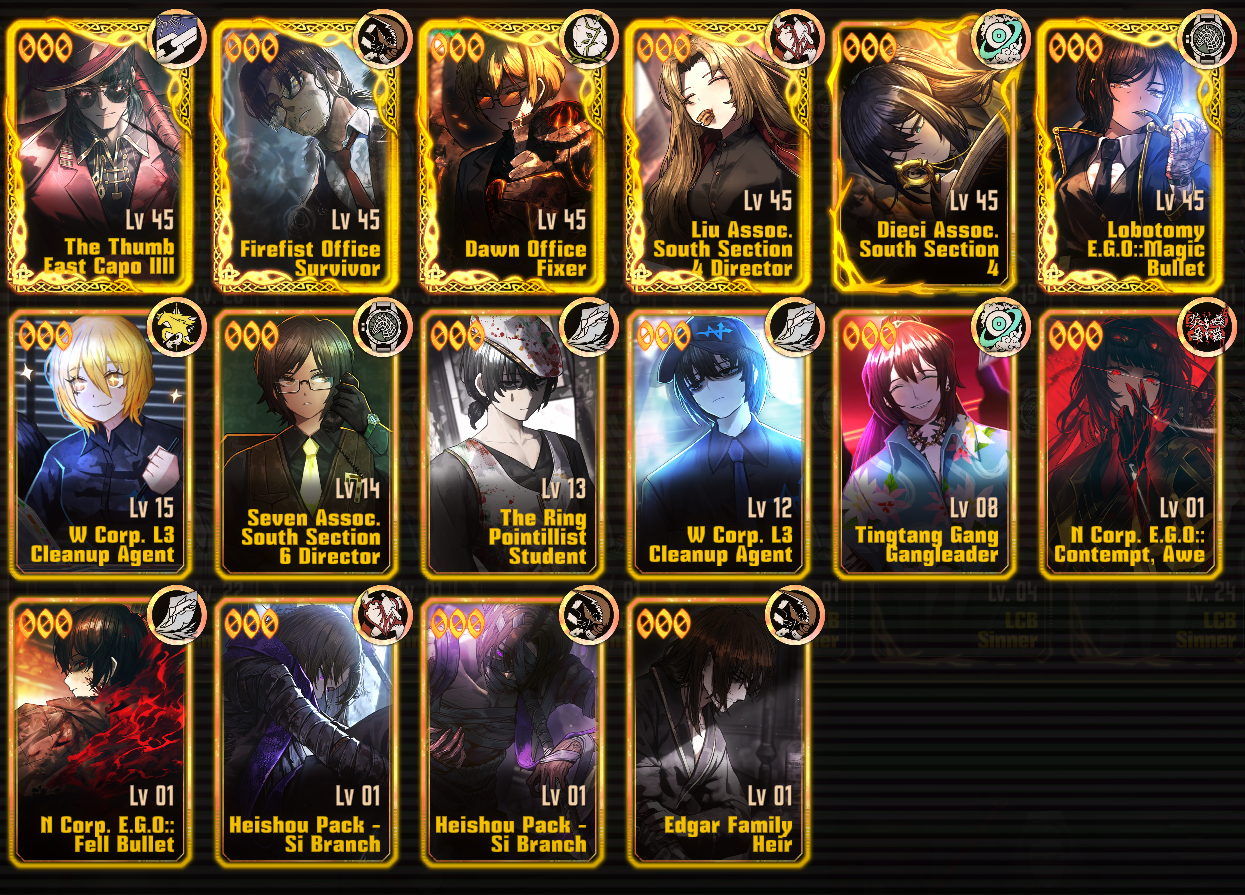 Previous thread: >>546971430Season 6 - 葬花吟 [Zàng Huā Yín]2025.05.15 —Season 7 - Kumo no Ito2025.Mirror Dungeon #6 - Mirror of Immortality2025.07.03 —Refraction Railway Line 5 - Merry Go Round2025.02.20 — 2025.11.20Refraction Railway - LINE 1 MADNESS BOKGAK2025.11.20 — >Current Events2025.11.06 — 2025.11.20The 7th Walpurgisnacht - A Certain Library's General Invitation2025.10.23 — 2025.11.20Chapter 6.5 Murder on the WARP Express BokGak>Upcoming Extractions2025.11.20 — 2025.12.04[000] Heishou Pack - You Branch Adept Heathcliff[000] Heishou Pack - Wei Branch Don Quixote>Current Extractions>The 7th Walpurgis Night Target Extraction2025.11.06 — 2025.11.20[000] Night Awls Capitano Gregor[000] Jeong's Office Rep Ishmael2025.11.06 — 2025.11.20Target Extraction: [ The 2nd & 3rd Walprugis Night ] ID & E.G.O>FAQs! This game is directly tied to the setting of Project Moon's previous games, Lobotomy Corporation and Library of Ruina, and is set after both. Expect spoilers for those games in this thread.! The tutorial is important.>Download linksAppStore: https://apps.apple.com/app/limbus-company/id6444112366Google Play: https://play.google.com/store/apps/details?id=com.ProjectMoon.LimbusCompanySteam: https://store.steampowered.com/app/1973530/Limbus_Company/>Other linksOfficial twitter: https://twitter.com/limbuscompany_bOfficial youtube: https://www.youtube.com/@ProjectMoonOfficialOfficial site: https://limbuscompany.global>Required readinghttps://mega.nz/folder/xosDkZ5Z#Wt4JpUt5Bb2XG77pxuuXpw>For all your EGO and Sinner info needshttps://limbus.kusoge.xyz/https://gll-fun.com/en/>Useful resources and a general guidehttps://rentry.org/lcg_resourceshttps://rentry.org/lcbguidehttps://rentry.org/LCB_optimal_grind_guidehttps://lcb-days-since-last-id.carrd.co/https://lcb-days-since-last-ego.carrd.co/>Countdownhttps://lcbcountdown.carrd.co/