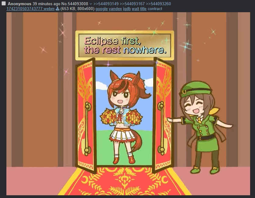 >>547018345>lets not pretend Umamasume doesn't have gay umas.There are no gay umas in uma musume. The yuribait is used for dramatic purposes, it doesn't actually reflect the real characters.