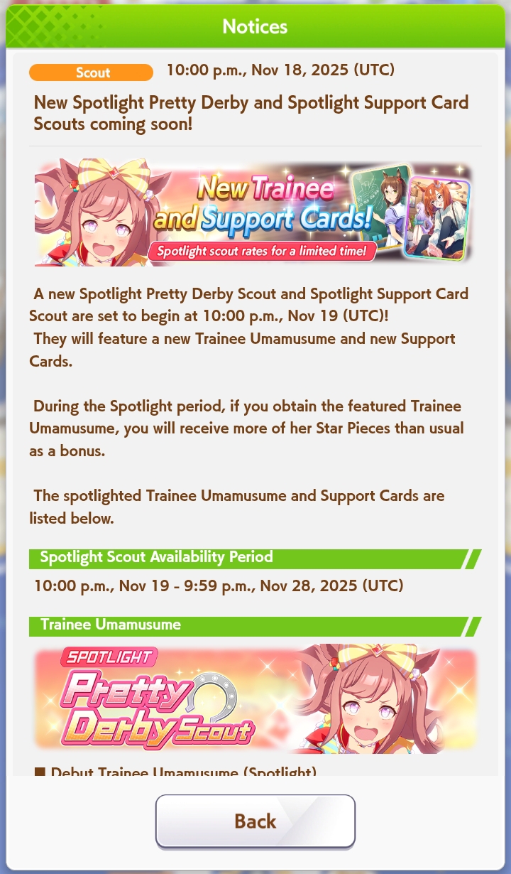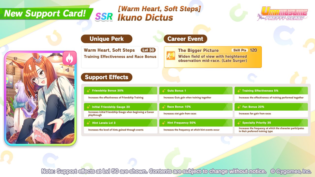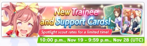 Previous: >>546987272>Global Game NewsCurrent Scenario: Aoharu Hai aka "Unity Cup"Current Specials Missions: Half Anniversary Part 2+3Current Rate Up: Hishi Akebono (3*) Matikanefukukitaru (3* Alt), Biko Pegasus (SSR), Sakura Bakushin O (SSR), Riko Kashimoto (SSR), Rice Shower (SSR)https://umamusume.com/news/100040/https://pages.snep.pw/uma/anni-skill-changes/11/13 - Legend Races11/16 - VIRGO CUP - Hanshin 1600m11/24 - Story event>JP Game NewsCurrent Rate Up: Wonder Acute alt (3*), SSR Mihono Bourbon (Power)New Scenario "Yukoma Hot Spring" releasedTimeline: https://uma.moe/timeline>IP NewsUmamusume Cinderella Gray 2nd season started weekly airings on 10/5>Thread Clubshttps://rentry.co/umaglobalclublistYou must be E3 (20k points) to join a circle. Apply with /uma/ or /vg/ in your profile or post ID in the thread.>All Guides & Resourceshttps://rentry.org/uma26Game databasehttps://gametora.com/umamusume (Click the gear to switch between JP / global server info)A basic guide for newfagshttps://rentry.org/umaglobalFind networks if your region is blocked from the game or clienthttps://www.umavpn.top/93Seiyuu & Concertshttps://rentry.org/umst