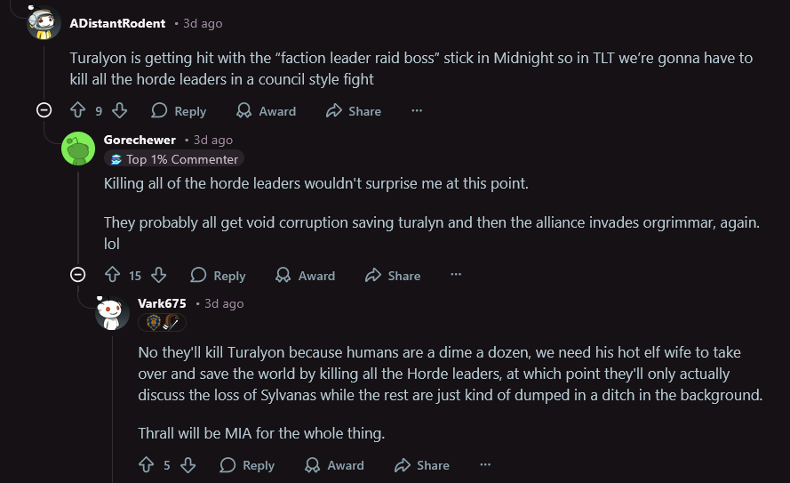 >>547076660Blizzard's own fault that everyone's jaded enough to say shit like this.Blizz have always been quick to give the Alliance their "moment to shine" if blues ever cried loud enough about feeling like they're not getting enough focus.Horde finally had enough with TWW where their faction was non existent in the launch content and felt falsely advertised to with Thrall on everything. Blizzard's response was just>Don't worry Horde, your time is coming soon!Then Undermine released with more Alliance NPCs involved in the plot than actual Horde, Gazlowe playing a backseat until Renzik the Mute has his heroic sacrifice and that became it for Horde in War Within. They weren't even invited to K'aresh like it was Argus all over again.Now the big Quel'thalas expansion is focused far more on Alliance, Paladins and Alliance Elf factions than any of the Horde characters who could be there and should be there.I expect by Blizzcon next year they'll have to announce a promise to Horde that a focus for them will be coming due to the backlash that's slowly bubbling as more and more of Midnight comes out.