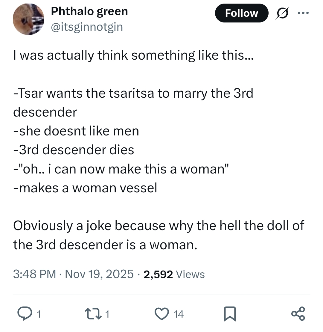 They are already setting everything to make Klee a clone and you are surprised that they genderbent Tsaritsa lover?This is a ML game faggot, every woman is for (You) (Aether) incluiding lesbians who will stop being lesbians once they meet youDon't like it? fuck off troon