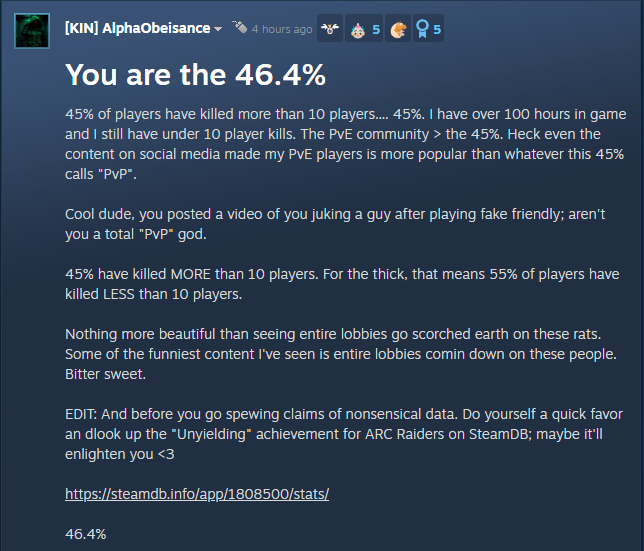 >Put on a youtuber yapping about arc raiders while i work>He mentions how "the ttk is so long you can turn around a fight if you get ambushed!">Footage chosen is 2 people jumping him and he lives at 1 HP and turns it back on them (cuz his team has 2 more people)>The only reason he lived is because the 2 attackers were freekitters with Rattlers and if they had stitchers he'd be fucking deadFurther proof freekits should only have rattlers