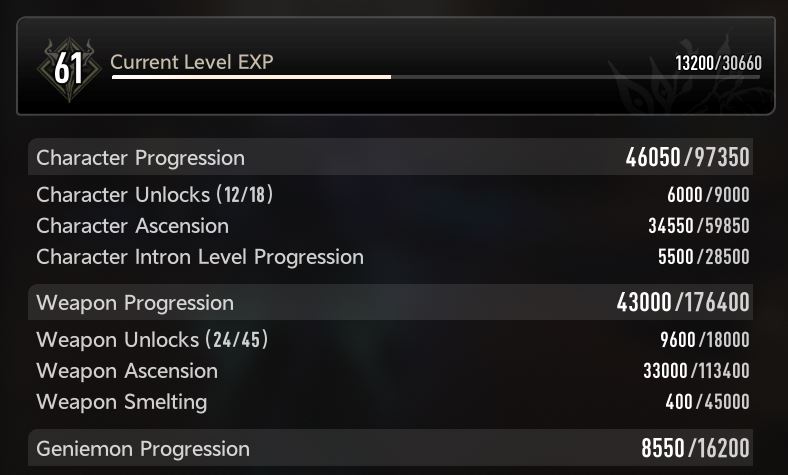 >>547180656So how long does it take to:1. farm 1400+ letters2. farm the 210 thoughts2. farm char exp + ascension materials to 803. farm skills to 8 to 10.And then have enough resources to actually upgrade the skills gated behind the weekly bosses, maze, fishing, and explorer coins.