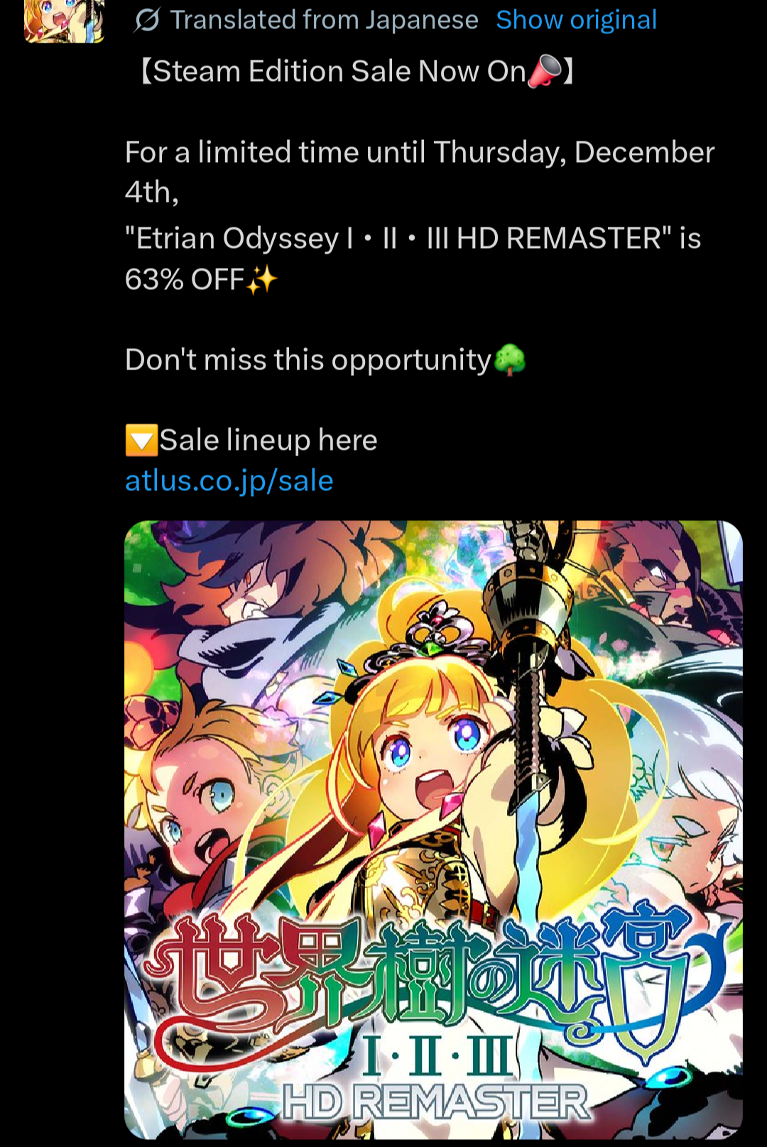 Etrian Odyssey Origins Collection:https://atlus.com/etrianorigins/https://sq-atlus.jp/sq123/>Origins Portrait Rips:https://mega.nz/folder/1tASnSbb#E23CLm1oJ71WrB0_gnt3lA>Origins Font Fixes:https://gamebanana.com/mods/447602 (EO1)https://gamebanana.com/mods/447609 (EO2)https://gamebanana.com/mods/447653 (EO3)>EO3 "Liberating" ModPC:https://files.catbox.moe/jodrax.zipPC hair version:https://files.catbox.moe/szvevp.zipSwitch:https://pixel drain com/u/AwKKreQ8Switch hair version:https://pixel drain com/u/mNu4HEeHEdited portraits:https://files.catbox.moe/gur7dr.zip>Beginner's Guide to the Series:https://imgur.com/a/ggW5g5U>Etrian Odyssey Resources (Mods/Patches, References, Data Dumps, Calculators, QR Codes, Skill Sims, etc.):https://pastebin.com/LBujh3ra>Etrian Odyssey Art Books:https://pastebin.com/Tm1xN2Jy>Etrian Odyssey FLAC Albums:https://pastebin.com/cE8mdiLF>Etrian Odyssey Lossy Albums:https://pastebin.com/crChVqLB>Nexus balance patch mod:https://mega.nz/#F!o1cXTSpB!SW5Ad-o8_pKYOa9LcbyiSg>Document containing some resources and informationhttps://docs.google.com/document/d/1m5G-ZQvXsmM68TCrSv2bWfKz2SfSc7xq-REfMXMhAEc/Previous thread: >>544475002