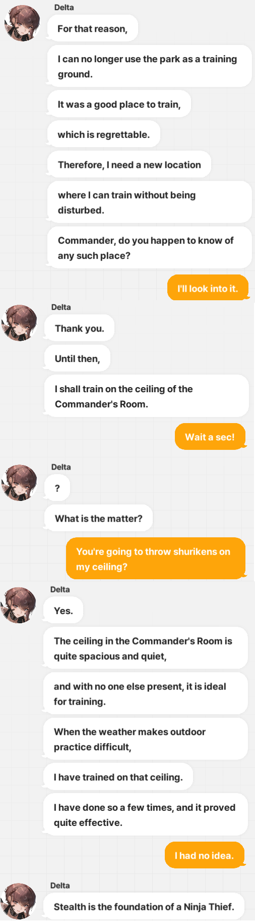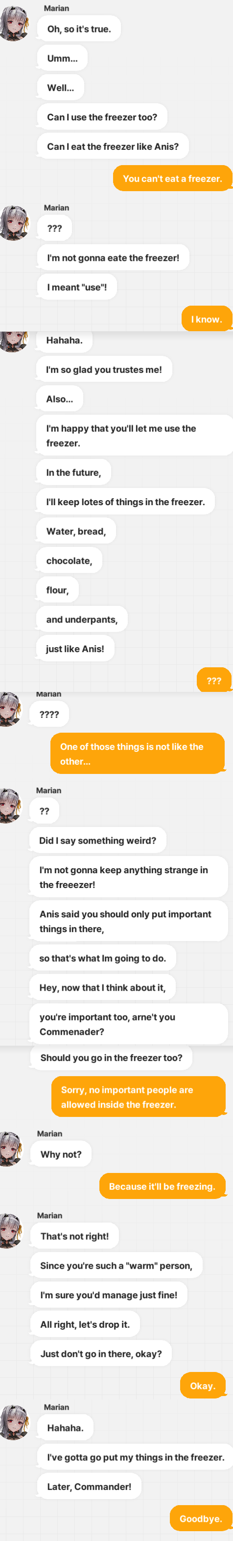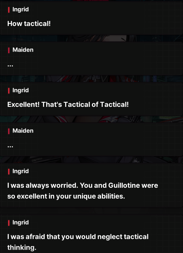 Ingrid seems to like me a lot. She sent Absolute, Brid, Marciana, Zwei, Signal, and Anchor Maid. Ein and Tove also visited me.