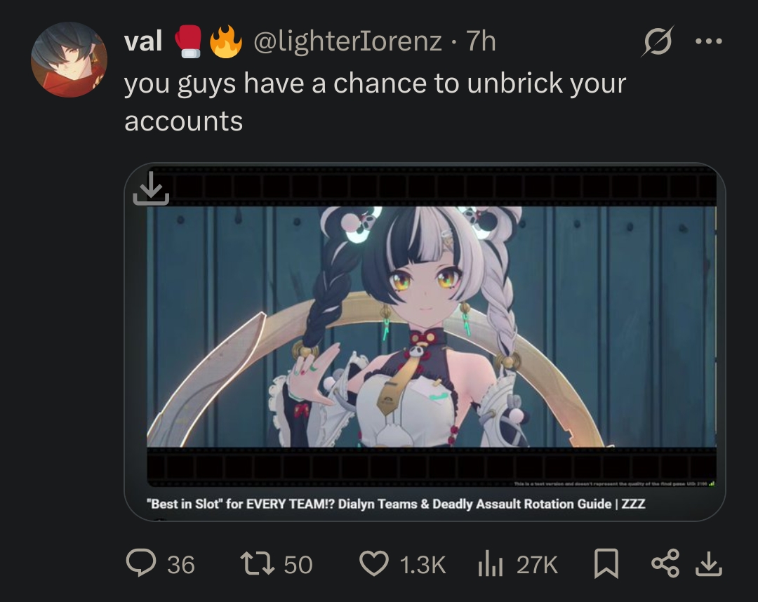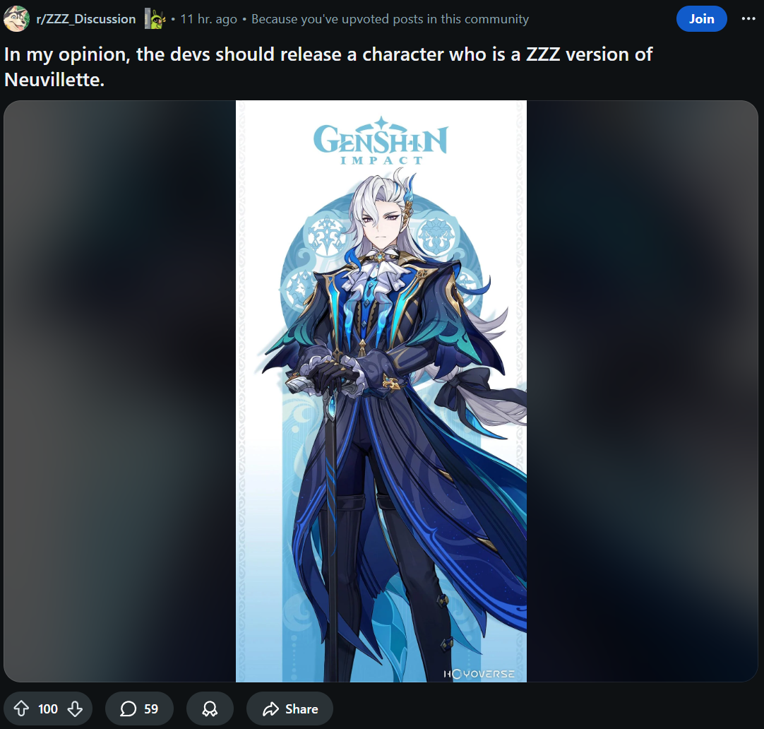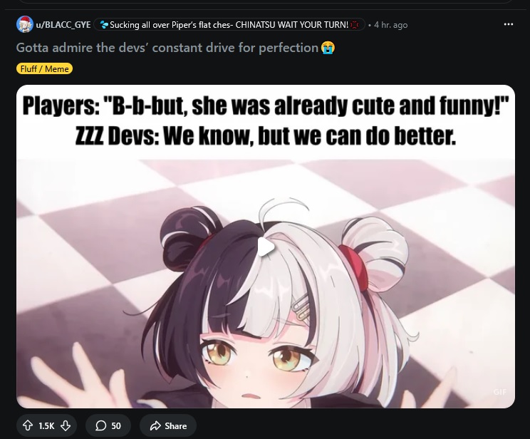 >>547442914No, they had a melty over Jufufu being a loli and shoving her ass to you multiple times during her animation. They also had a melty over Seed feet and Manato being A rank.The actual usable subreddit is r/ZenlessZoneZero.