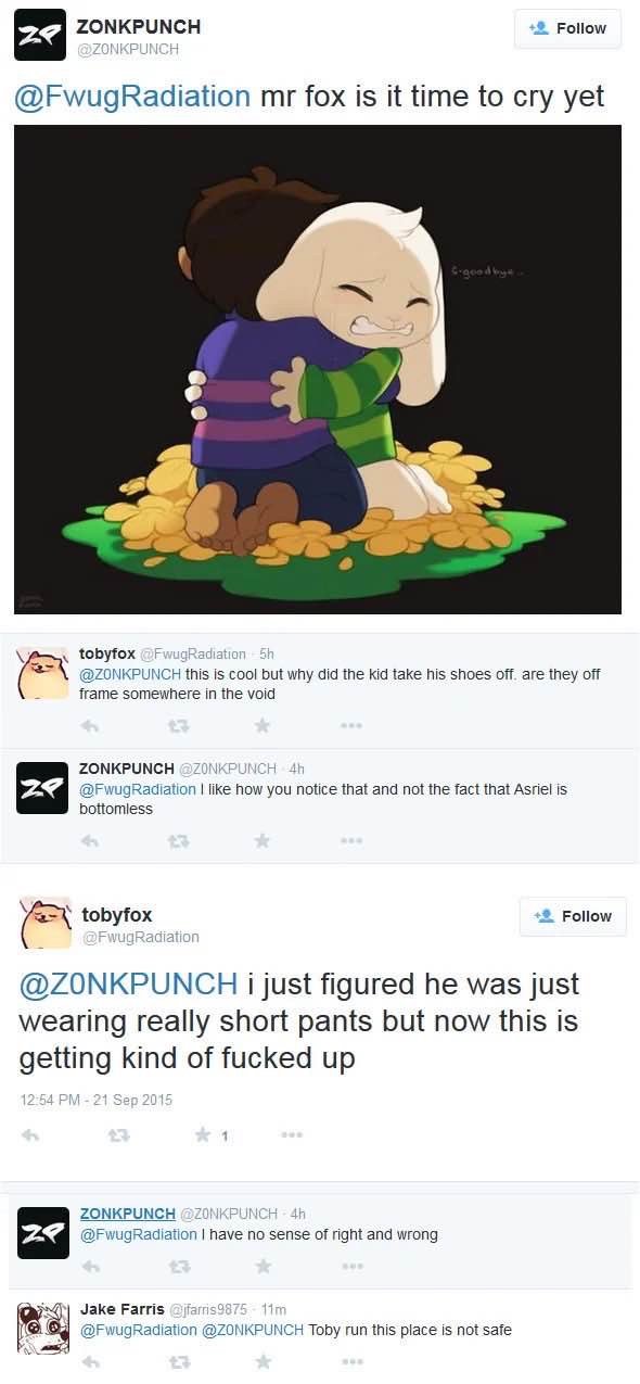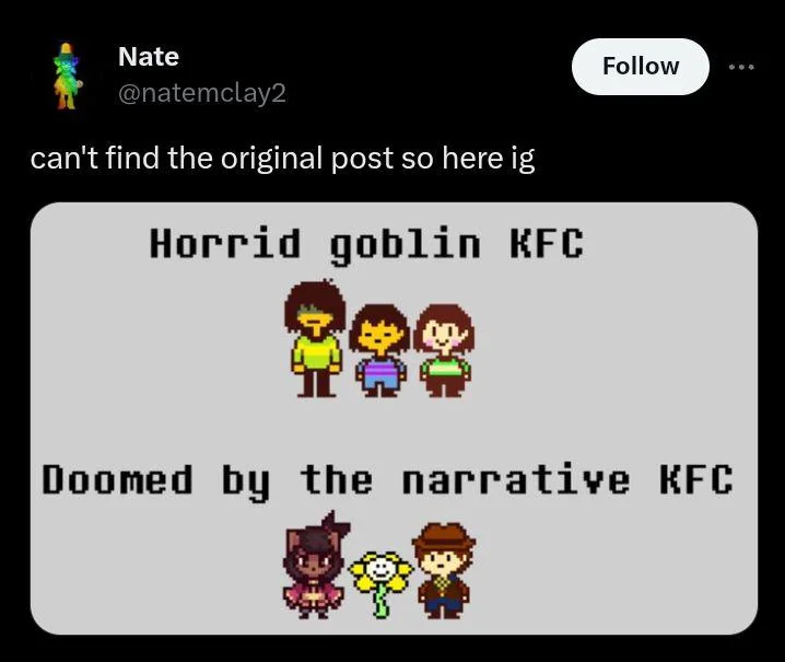 I love how people now suddenly believe the message of undertale was "Be a good person, don't be a pedophile" Like, its this sort of infantalizing shit that pisses me off. No thats not the main theme of Undertale, the main theme is literally forgiveness and redemption no matter what but since that'd be a little problematic and wouldnt make for a good twitter dunk, we're just ignoring the entire fucking game now