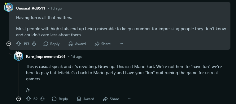 >>547497639I'm not having fun if my k/d is negative, so actually I'm doing both.