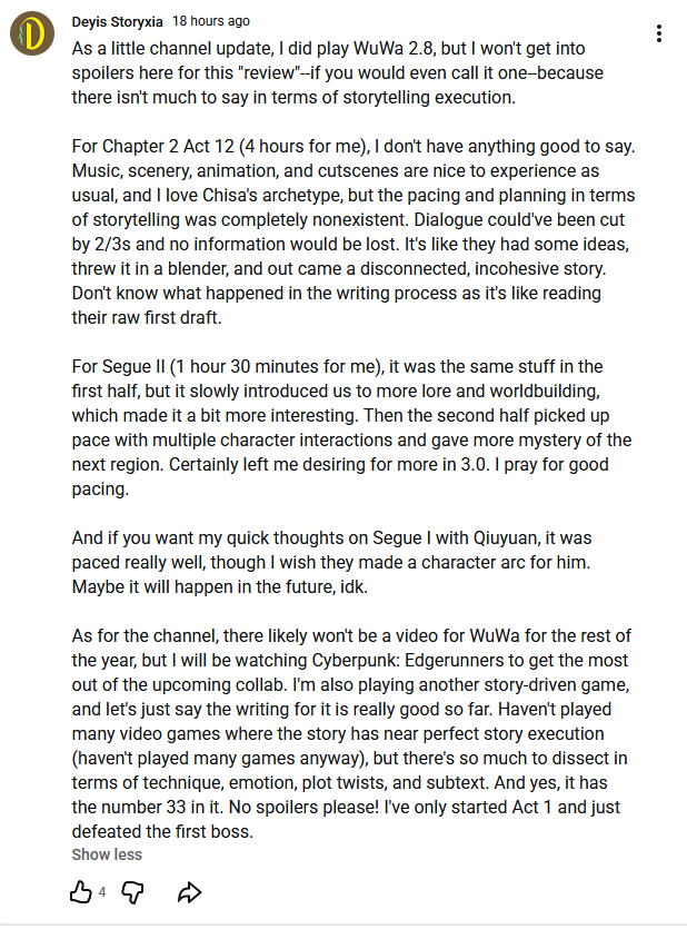 >>547555421easy, people liked that rover failed and gave a clumsy but still attempted morale question whether he should feel bad due to erasing his memories and being a hypocrite or just that because he lost his memories Phrolova shouldn't blame him and just let go of the past like he did. Nothing interesting happened in comparison with Chisa, she is just another girl who was promised by an NPC that Rover will come and save her dumb ass and that's it that was the twist. Part 2 made it better with the whole she thought she was in this sonosphere for two months but it was actually two decades and you can tell that hit her hard which has nothing to do with Rover.