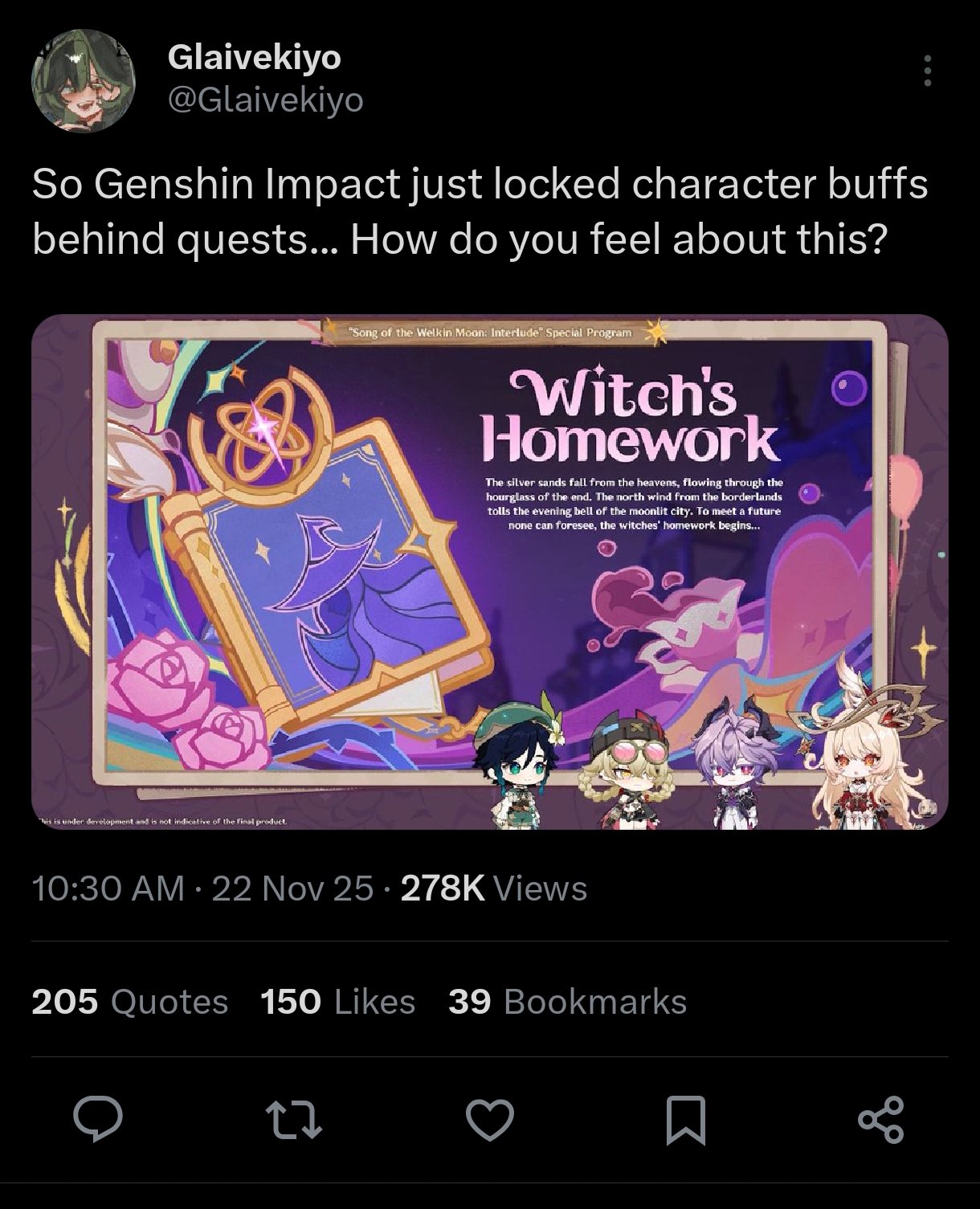 >>547557730They can't always pull it off. Have you seen their attempts at humor in other patches? Remember Zani and Phoebe's "funny" "interactions" in the vault quest? And let's be honest I can't imagine how boring those party scenes would have been if Camellya didn't show up.