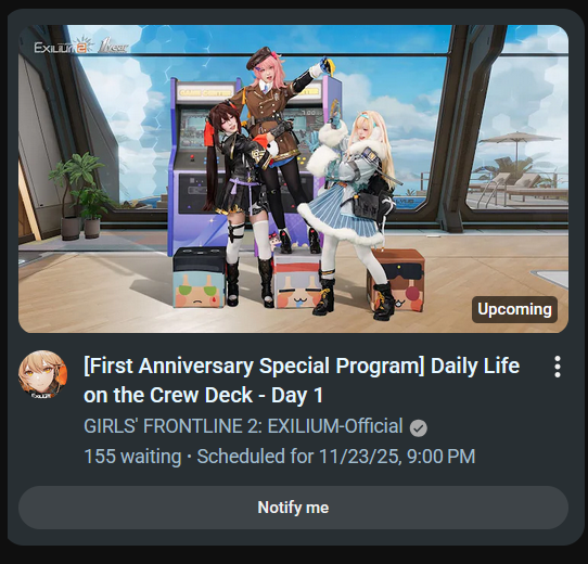 This is a thread for Girls' Frontline 2: Exilium, refer to /gfg/ for other MICA/Sunborn games.>DARKWINTER SERVERhttps://gf2exilium.sunborngame.com/mainhttps://store.steampowered.com/app/3347400/GIRLS_FRONTLINE_2_EXILIUM/>HAOPLAY SERVERhttps://gf2.haoplay.com/en/https://store.steampowered.com/app/3308670/GIRLS_FRONTLINE_2_EXILIUM/>CURRENT/UPCOMING BANNERS AND EVENTShttps://pastebin.com/WReMZrek>RESOURCE COMPILATION (GUIDES, STORY, STICKERS, MODDING, ETC.)https://pastebin.com/xeYHpwtN>PLATOONS LISThttps://docs.google.com/spreadsheets/d/1hK9OFgo7MS-ONpvoek2H7UU5CaKq3lu5G2yqDPH5qtE>DO NOT REDEEMN/APrevious Thread: >>547494427