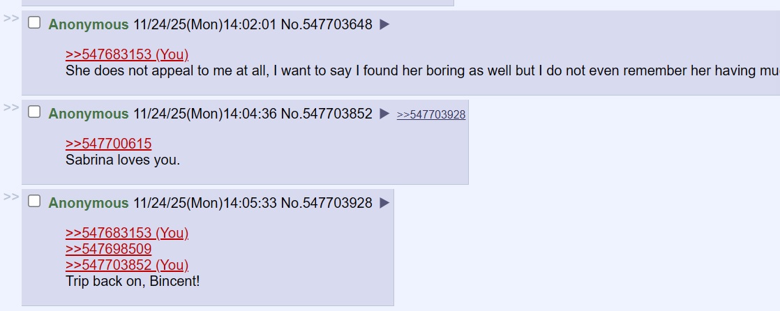 >>547683153>>547698509>>547703852Trip back on, Bincent!