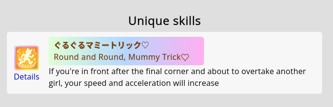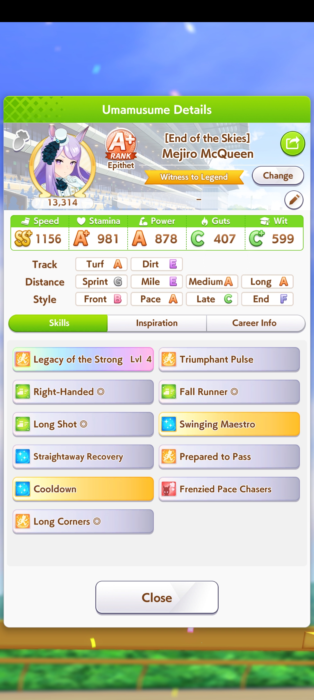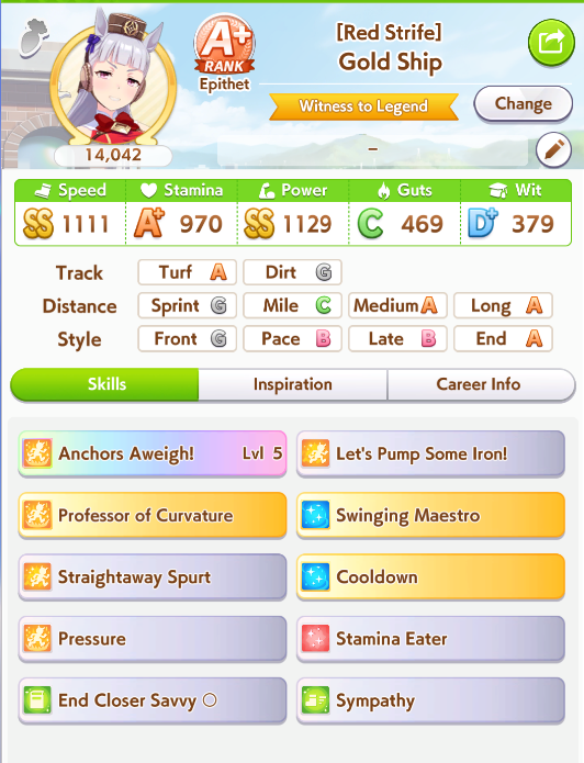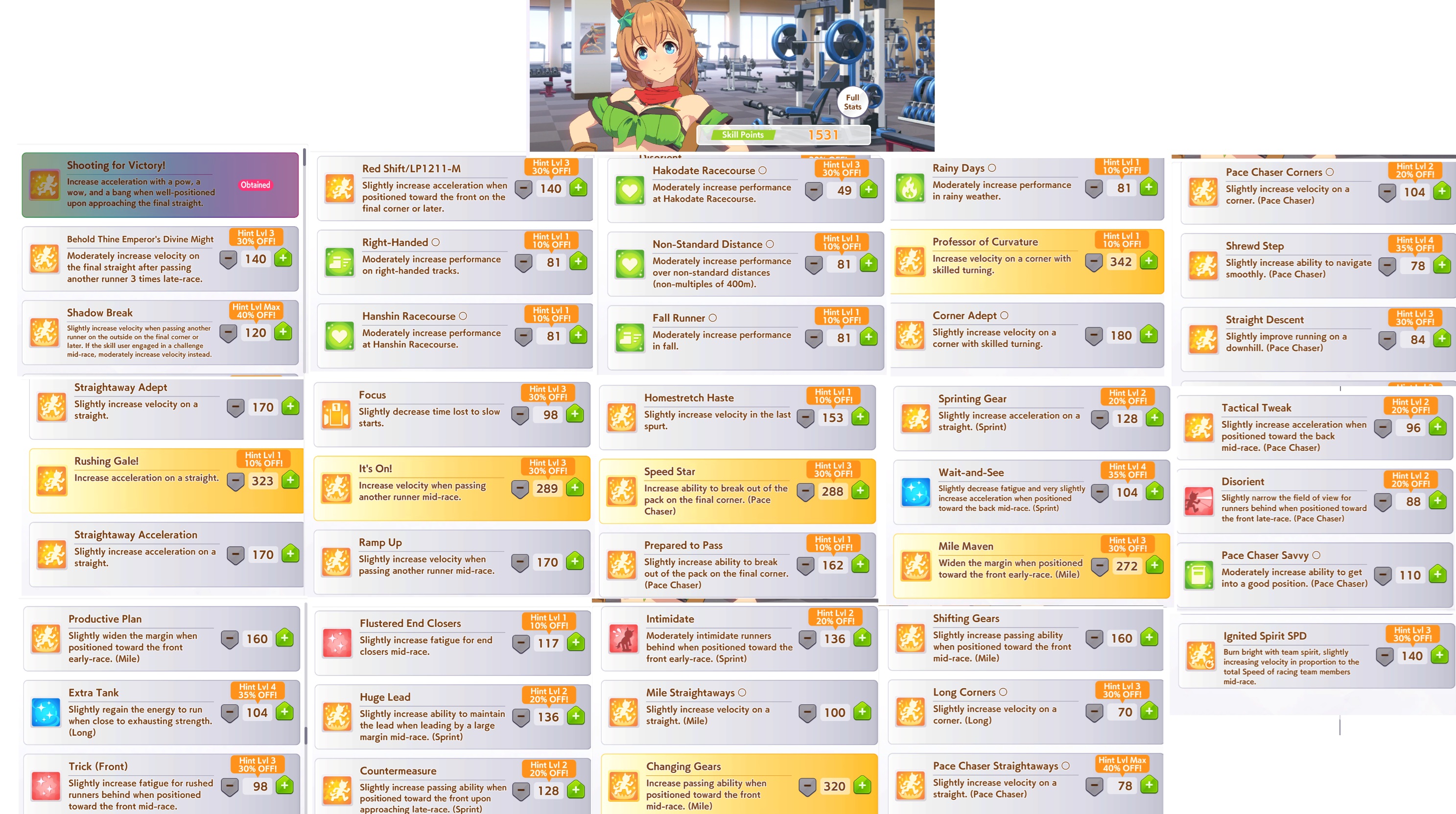 >>547662432>Build my uma for meNo. Prioritize late-race/final spurt acceleration, and guaranteed late-game velocity. Give secondary priority to mid-race skills that help you keep your position. Check the CM page on gametora to see the layout of the track so you can pick between skills based on where they trigger.