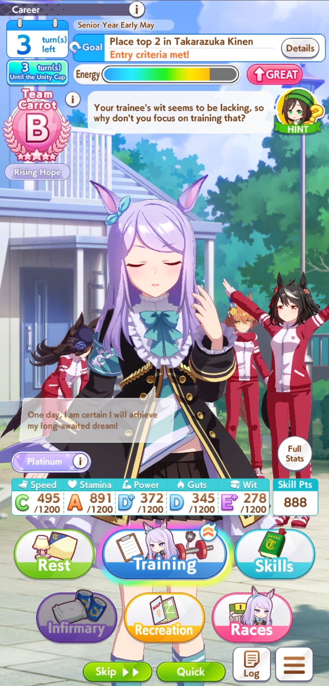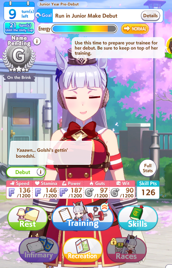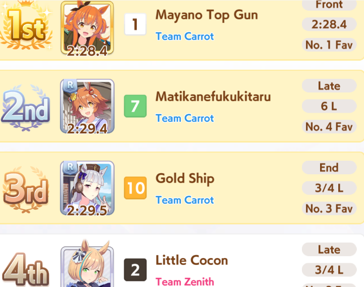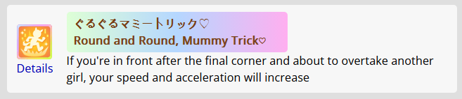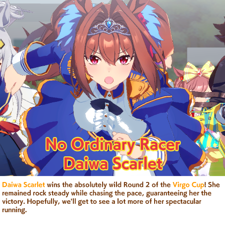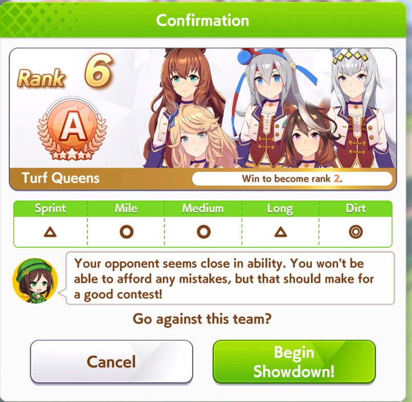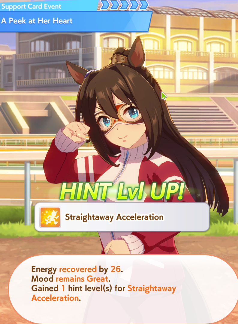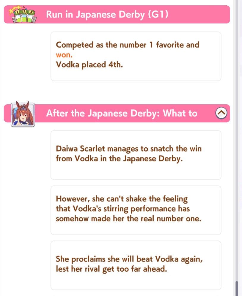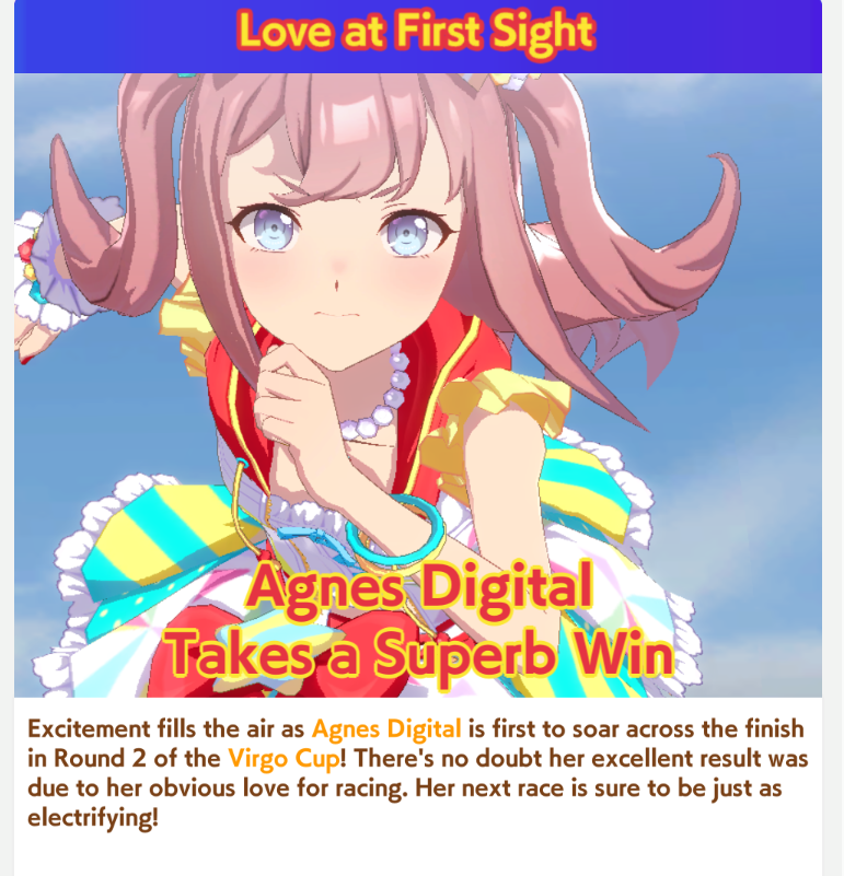>>547663560Yep. And if you get her long aptitude up and win it she complains it isn't a "cool" enough race for her and she wants to vroom vroom in a mile instead