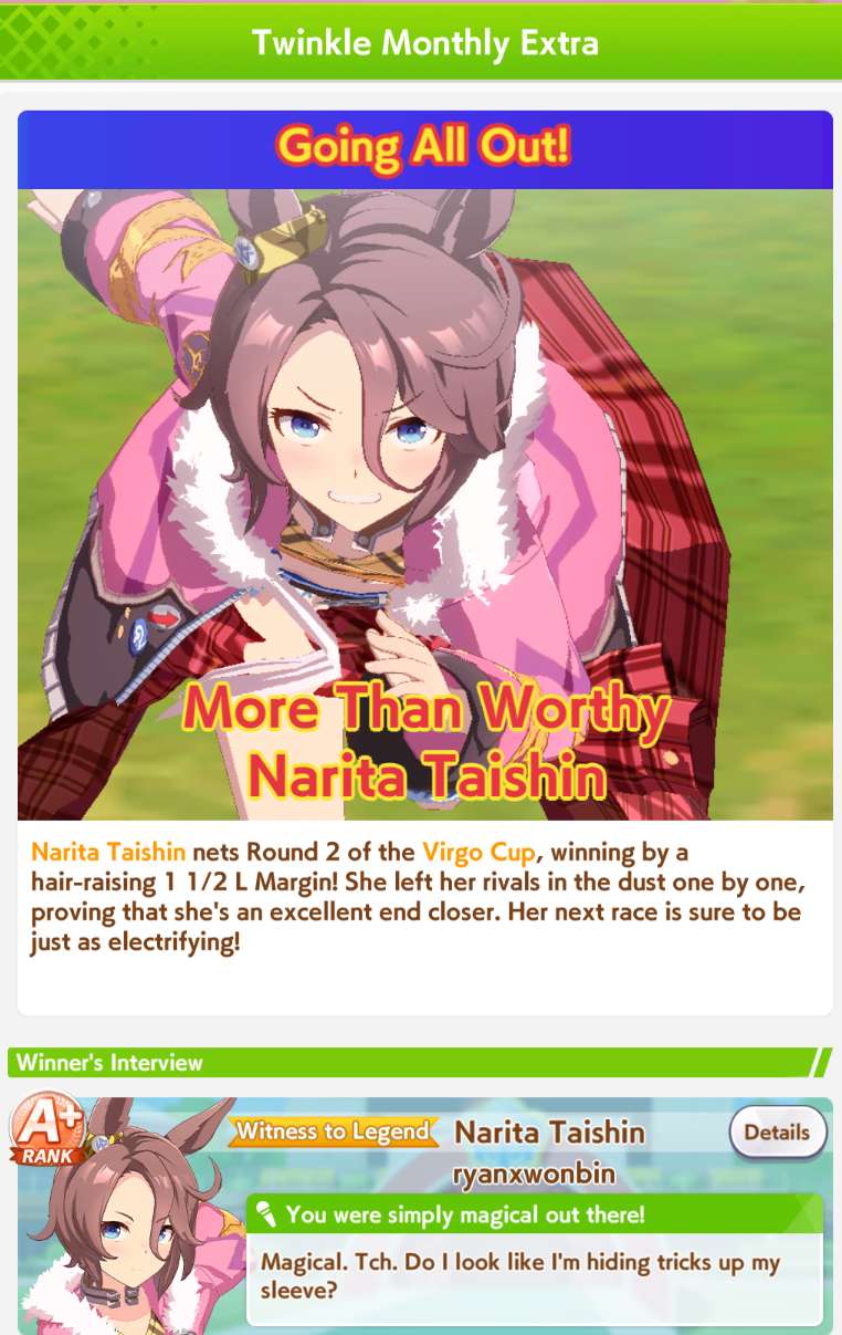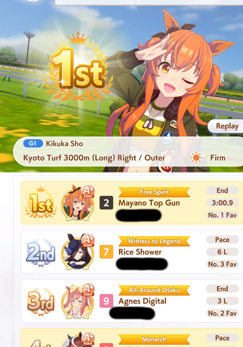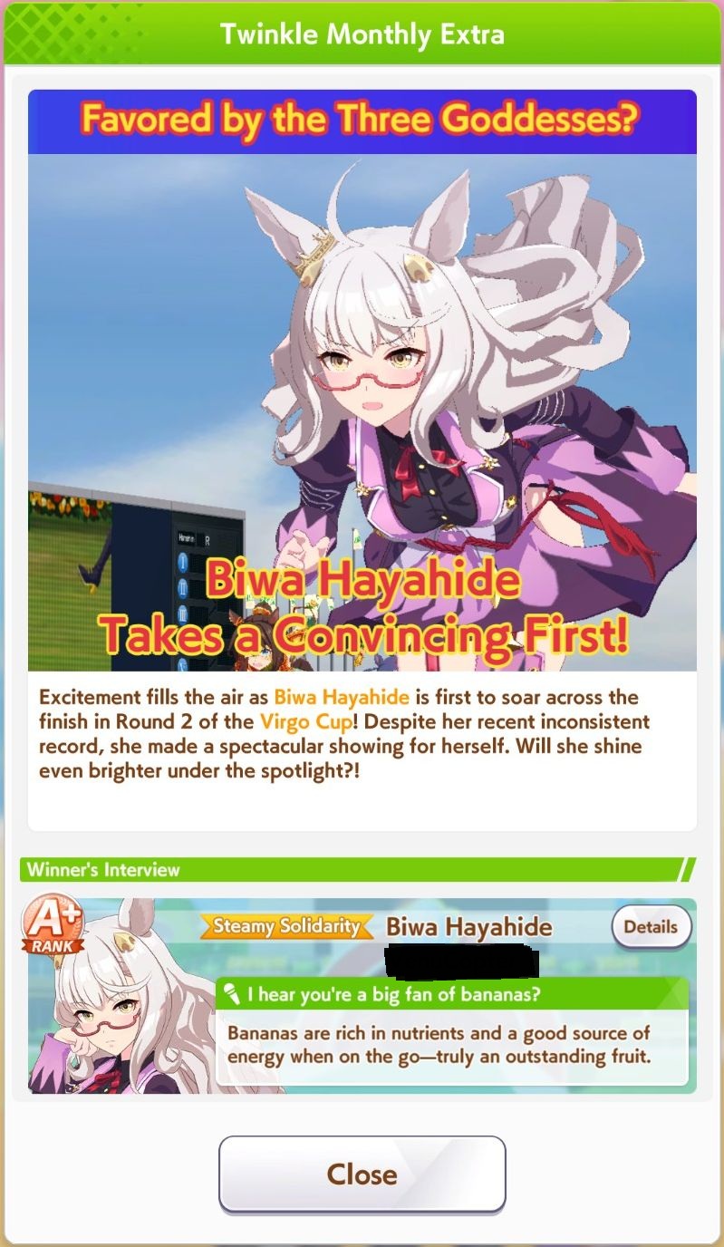 Previous >>547626740>Global Game NewsCurrent Scenario: Aoharu Hai aka "Unity Cup"Current Specials Missions: Half Anniversary Part 2+3Current Rate Up: Agnes Digital (3*), Hishi Akebono (3*), Ikuno Dictus (SSR), Biko Pegasus (SSR), Sakura Bakushin O (SSR), Fine Motion (SR)Current CM: VIRGO CUP - Hanshin 1600mhttps://umamusume.com/news/100040/https://pages.snep.pw/uma/anni-skill-changes/11/24 - Story eventDecember TBA - LIBRA CUP - Kyoto 3000m>JP Game NewsCurrent Rate Up: Buena Vista (3*), Transcend (3* Alt), Wonder Acute (3* Alt), Tokai Teio (SSR), Mihono Bourbon (SSR), Kiyoko Hoshina (SSR)New Scenario "Yukoma Hot Spring" releasedTimeline: https://uma.moe/timeline>IP NewsUmamusume Cinderella Gray 2nd season started weekly airings on 10/5>Thread Clubshttps://rentry.co/umaglobalclublistYou must be E3 (20k points) to join a circle. Apply with /uma/ or /vg/ in your profile or post ID in the thread.>All Guides & Resourceshttps://rentry.org/uma26Game databasehttps://gametora.com/umamusume (Click the gear to switch between JP / global server info)A basic guide for newfagshttps://rentry.org/umaglobalFind networks if your region is blocked from the game or clienthttps://www.umavpn.top/93Seiyuu & Concertshttps://rentry.org/umst