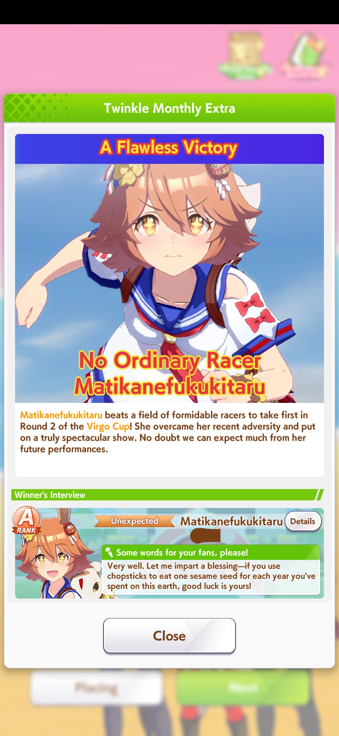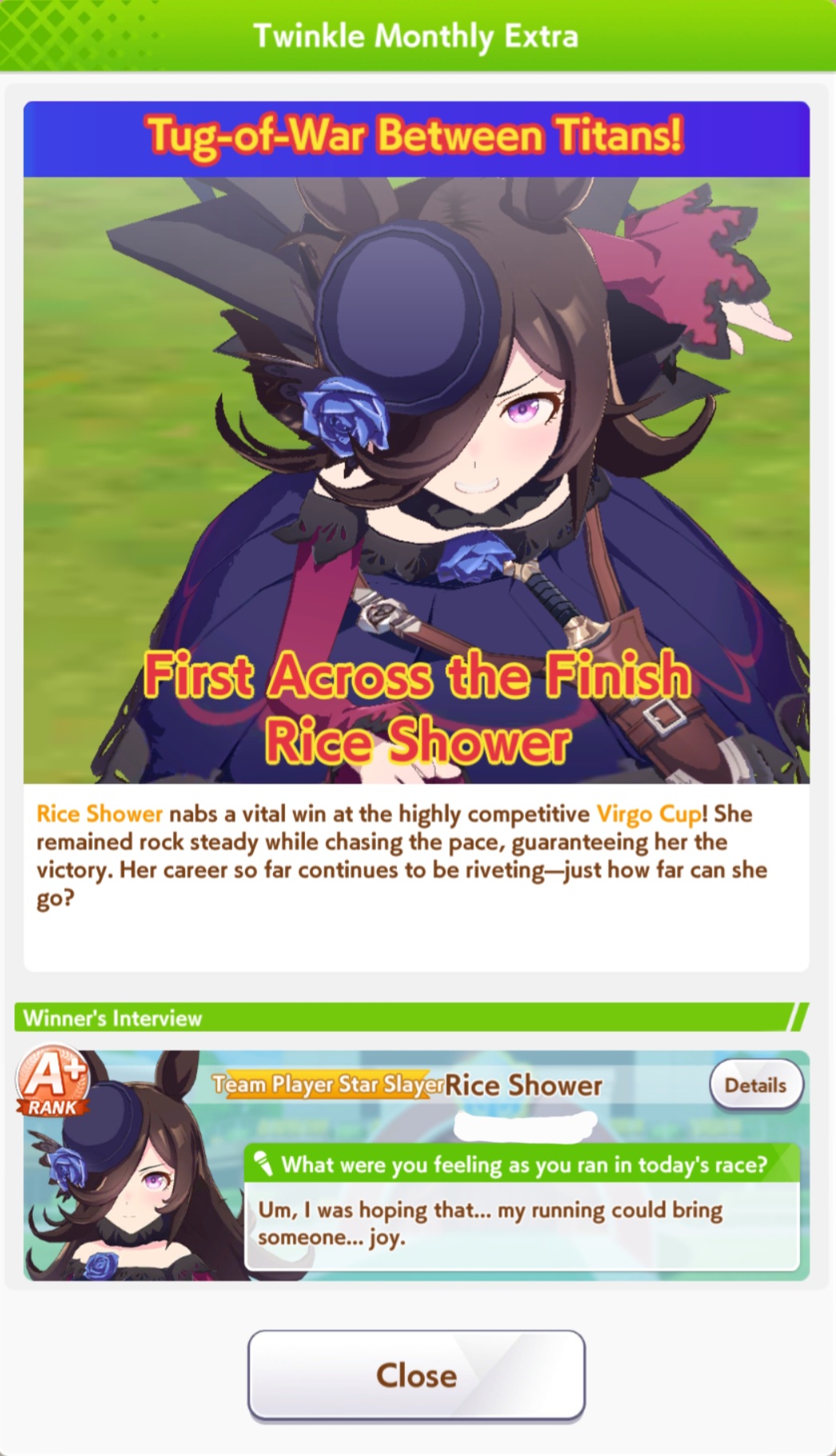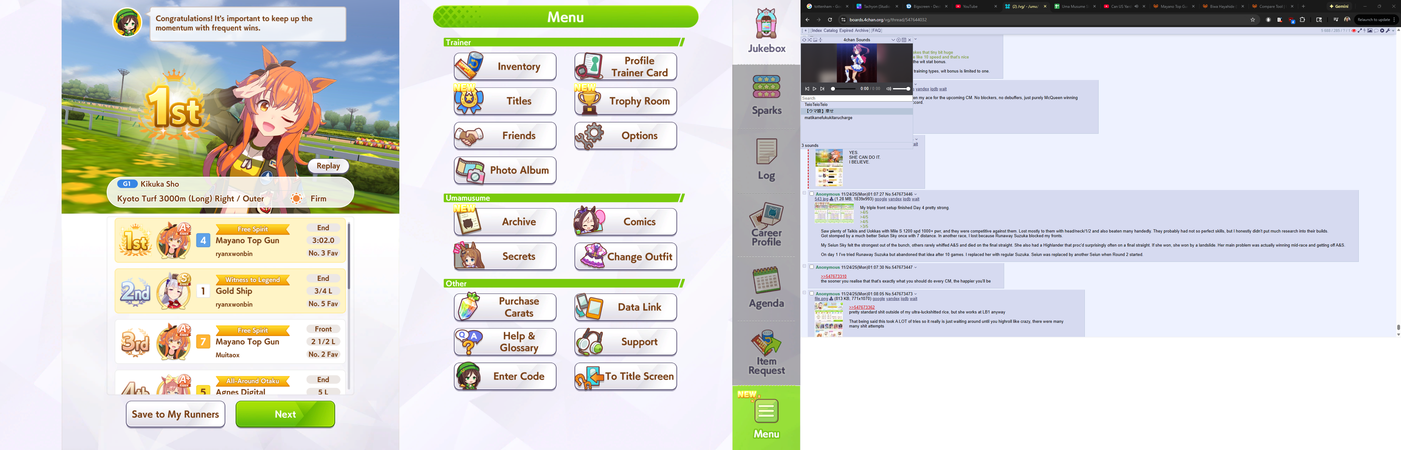 Previous >>547626740>Global Game NewsCurrent Scenario: Aoharu Hai aka "Unity Cup"Current Specials Missions: Half Anniversary Part 2+3Current Rate Up: Agnes Digital (3*), Hishi Akebono (3*), Ikuno Dictus (SSR), Biko Pegasus (SSR), Sakura Bakushin O (SSR), Fine Motion (SR)Current CM: VIRGO CUP - Hanshin 1600mhttps://umamusume.com/news/100040/https://pages.snep.pw/uma/anni-skill-changes/11/24 - Story eventDecember TBA - LIBRA CUP - Kyoto 3000m>JP Game NewsCurrent Rate Up: Buena Vista (3*), Transcend (3* Alt), Wonder Acute (3* Alt), Tokai Teio (SSR), Mihono Bourbon (SSR), Kiyoko Hoshina (SSR)New Scenario "Yukoma Hot Spring" releasedTimeline: https://uma.moe/timeline>IP NewsUmamusume Cinderella Gray 2nd season started weekly airings on 10/5>Thread Clubshttps://rentry.co/umaglobalclublistYou must be E3 (20k points) to join a circle. Apply with /uma/ or /vg/ in your profile or post ID in the thread.>All Guides & Resourceshttps://rentry.org/uma26Game databasehttps://gametora.com/umamusume (Click the gear to switch between JP / global server info)A basic guide for newfagshttps://rentry.org/umaglobalFind networks if your region is blocked from the game or clienthttps://www.umavpn.top/93Seiyuu & Concertshttps://rentry.org/umst