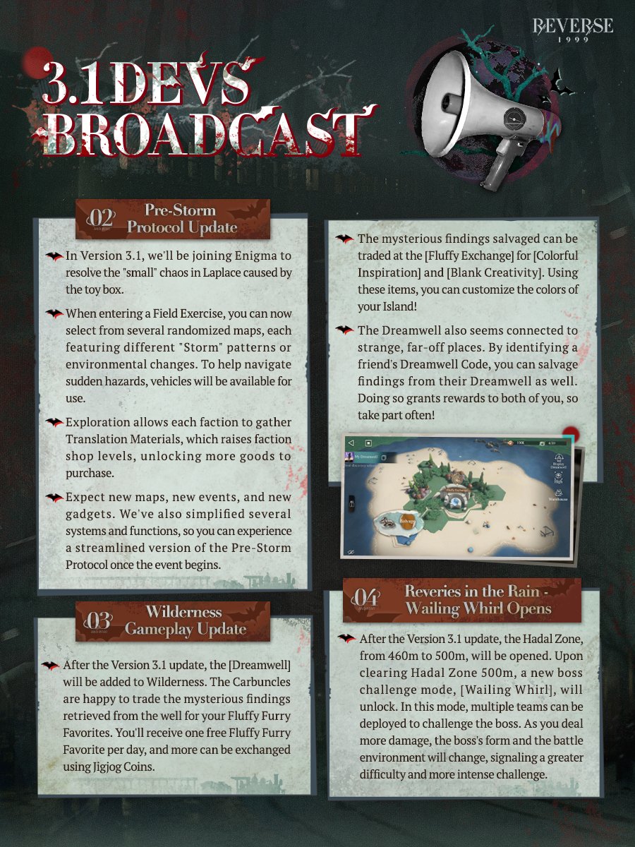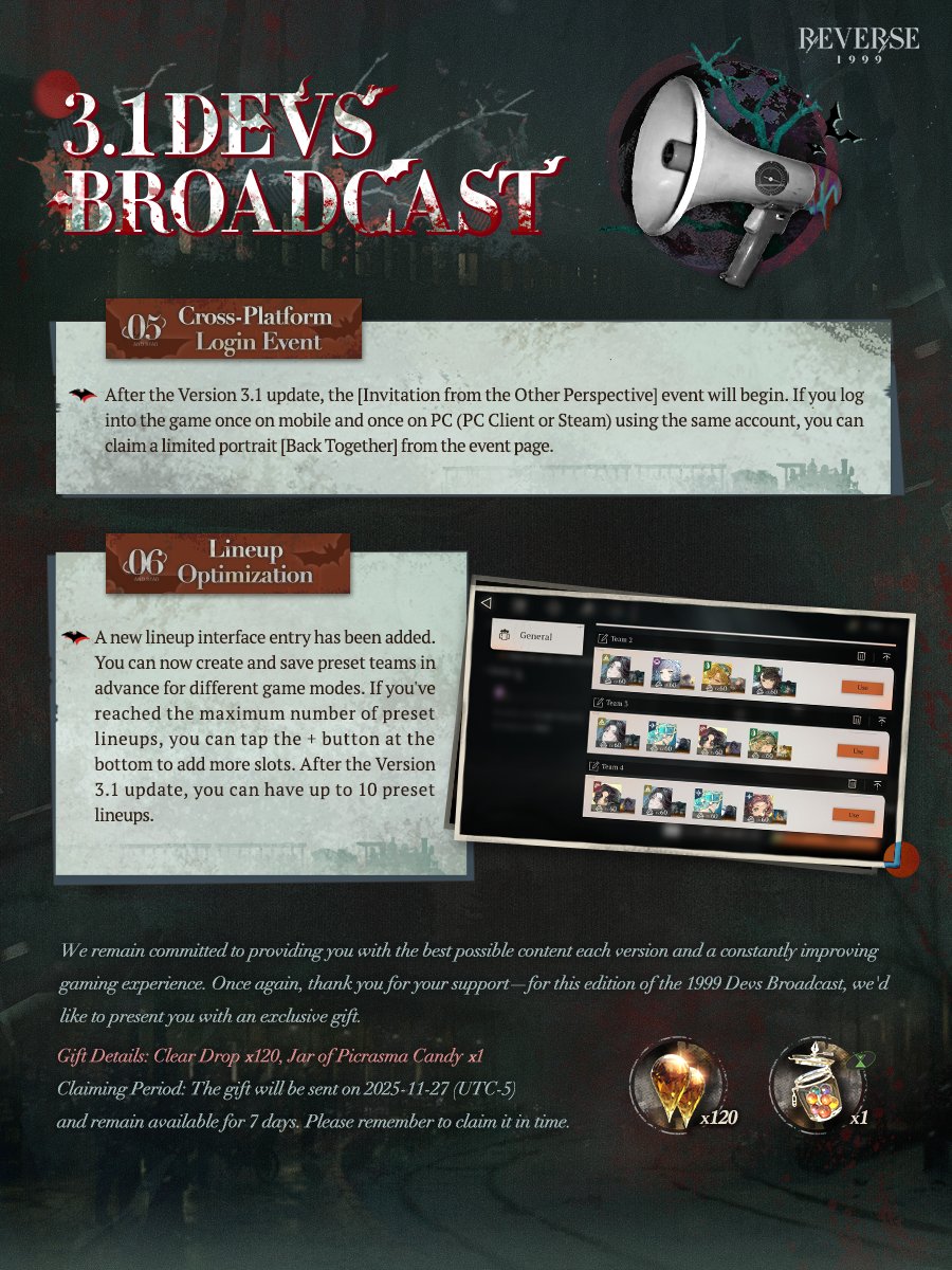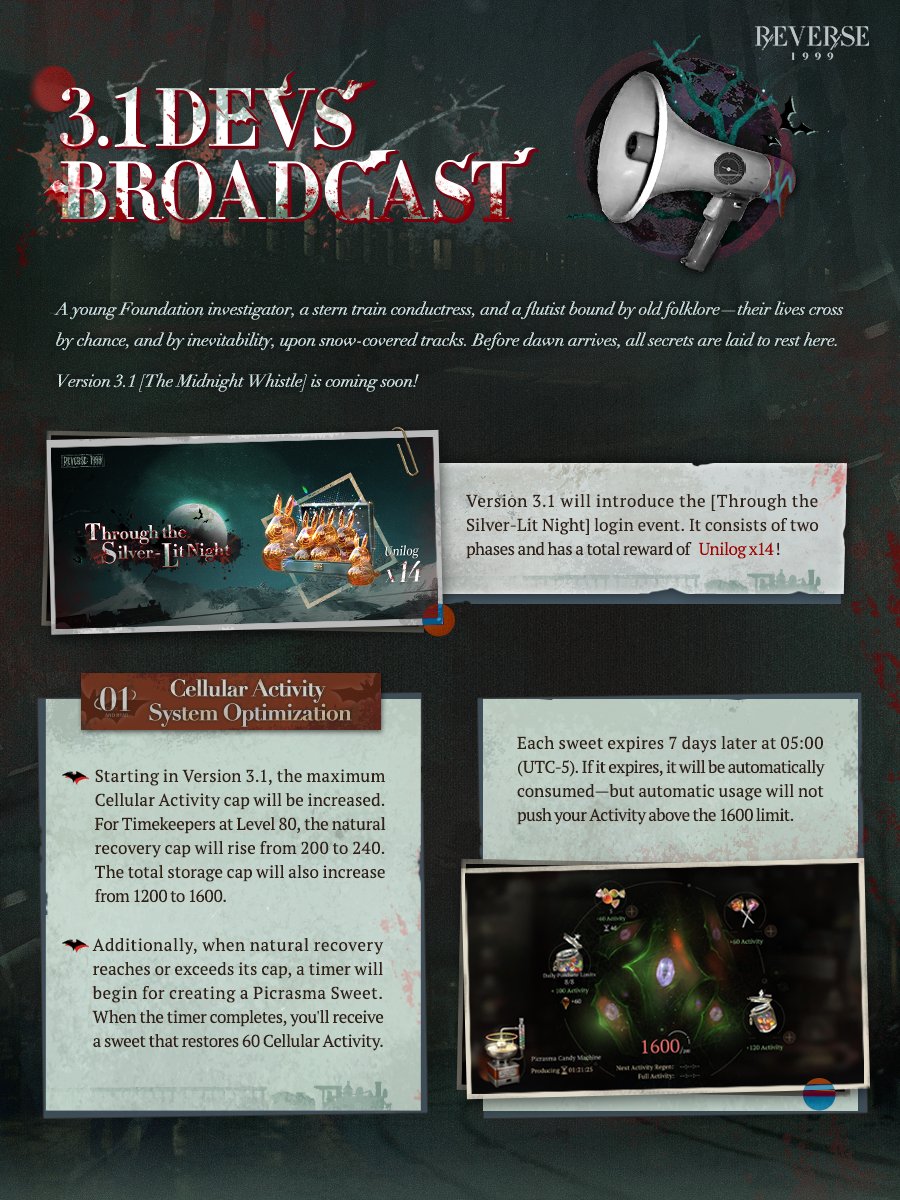 Previous Era: >>547578876>General InfoReverse: 1999 is a turn-based gacha RPG with gameplay revolving around the use of spell cards. The game focuses on storytelling, with a rich main story mode and frequent side-story events. The game is fully voiced in 4 languages, with English as the primary one. There are no PvP elements, you can play at your own pace.Daily reset is at 5AM UTC-5GL 3.0 - http://youtu.be/H89LH6CahVQ / http://youtu.be/GpuIRnAQSaQCN 3.1 - http://youtu.be/GjFAnAjGB0MCN 3.2 - http://youtu.be/5ct2853htF010/30 - 12/08 | A LONG LONG WAY>Current Content11/01 - 12/11 | Mane's Bulletin11/20 - 12/04 | UTTU Market Special Week 1-5 (Week 6-10 on 11/27)11/20 - 12/11 | Fuga a 3 Soggetti (Charon's Story)>Upcoming Content11/28 - 12/08 | Chronicles of Uluru: London Dawning (Rerun)12/04 - 12/11 | Steam Whistle Prelude (3.1 Teaser)12/11 - 12/?? | Version 3.1 - The Midnight Whistle>Current Banners11/20 - 12/11 | ※ | Charon (Spirit Support) - http://youtu.be/6vHGHrb-mgM10/30 - 11/27 | ◈ | Euphoria Rate-up 1x100%: Centurion, Druvis, Ezra, Getian, Medicine Pocket, Semmelweis11/18 - 12/02 | ⟳ | Isolde(Spirit DPS)>Upcoming Banners12/11 - ??/?? | ※ | Rubuska (Mineral Support) - http://youtu.be/u-FGTP23Fq0??/?? - ??/?? | ※ | Corvus (Intellect DPS) - http://youtu.be/BBJGC0_eVWk>[ Download ] http://re1999.bluepoch.com | http://store.steampowered.com/app/3092660>[ Resources ] http://rentry.org/1999-resources>[ Merchandise ] http://reverse1999.store>Codes1999GIFT, 5YRBRF9, GachaGaming1999, Series3Unveiled, BygoneDays, YesterdaysWorld, DustCladBody, NamelessOne, Borderline, GodsInSilent, WanderingSoul