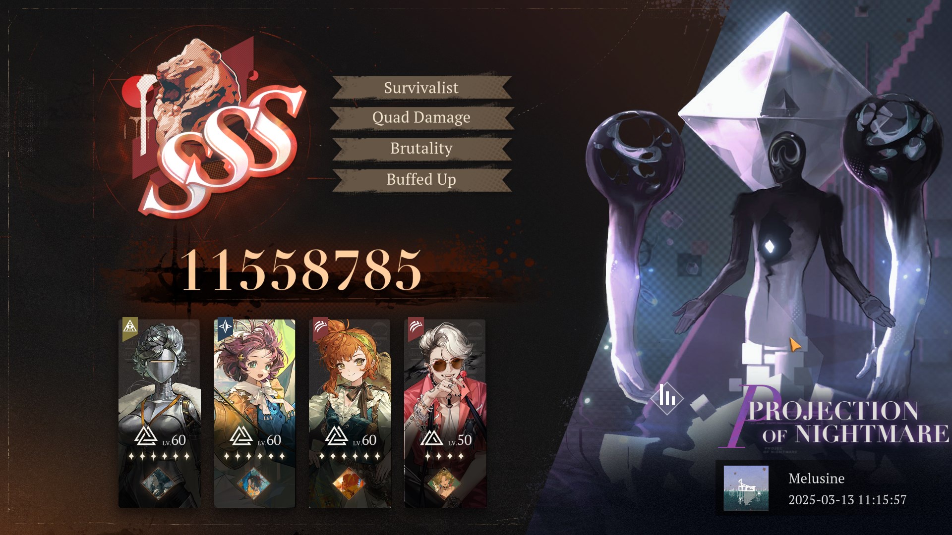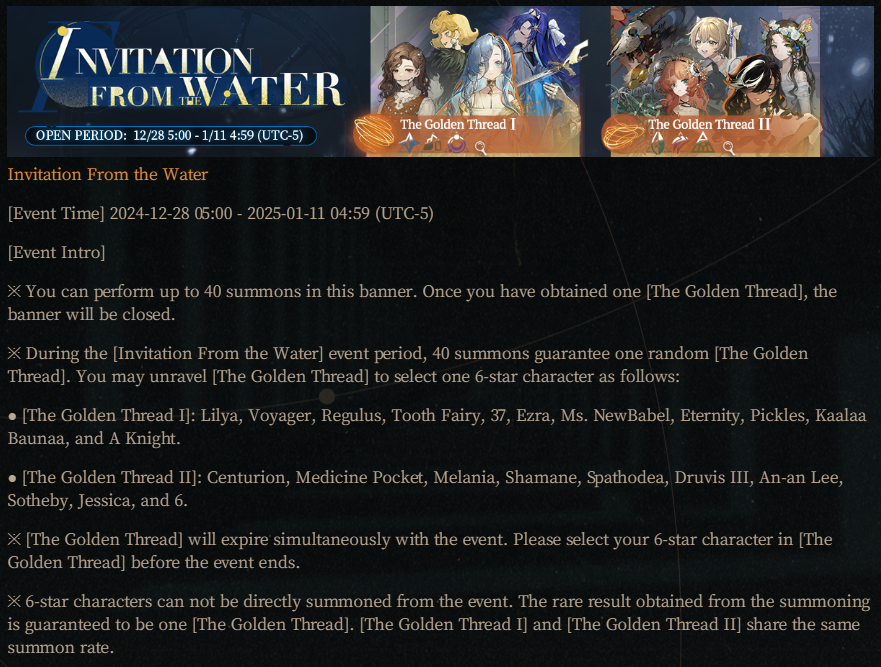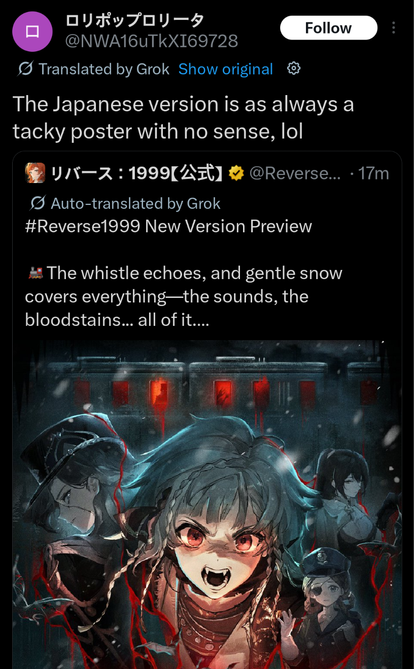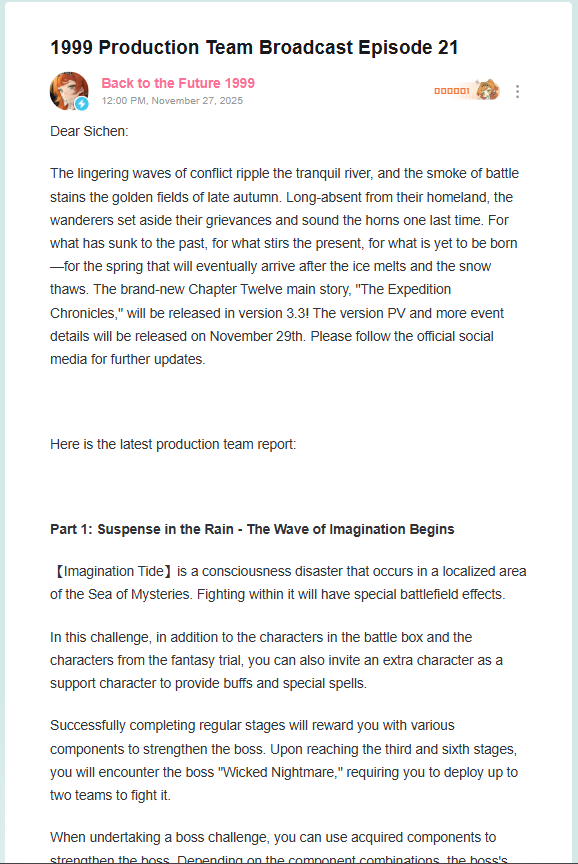 Previous Era: >>547578876>General InfoReverse: 1999 is a turn-based gacha RPG with gameplay revolving around the use of spell cards. The game focuses on storytelling, with a rich main story mode and frequent side-story events. The game is fully voiced in 4 languages, with English as the primary one. There are no PvP elements, you can play at your own pace.Daily reset is at 5AM UTC-5GL 3.0 - http://youtu.be/H89LH6CahVQ / http://youtu.be/GpuIRnAQSaQCN 3.1 - http://youtu.be/GjFAnAjGB0MCN 3.2 - http://youtu.be/5ct2853htF010/30 - 12/08 | A LONG LONG WAY>Current Content11/01 - 12/11 | Mane's Bulletin11/20 - 12/04 | UTTU Market Special Week 1-5 (Week 6-10 on 11/27)11/20 - 12/11 | Fuga a 3 Soggetti (Charon's Story)>Upcoming Content11/28 - 12/08 | Chronicles of Uluru: London Dawning (Rerun)12/04 - 12/11 | Steam Whistle Prelude (3.1 Teaser)12/11 - 12/?? | Version 3.1 - The Midnight Whistle>Current Banners11/20 - 12/11 | ※ | Charon (Spirit Support) - http://youtu.be/6vHGHrb-mgM10/30 - 11/27 | ◈ | Euphoria Rate-up 1x100%: Centurion, Druvis, Ezra, Getian, Medicine Pocket, Semmelweis11/18 - 12/02 | ⟳ | Isolde(Spirit DPS)>Upcoming Banners12/11 - ??/?? | ※ | Rubuska (Mineral Support) - http://youtu.be/u-FGTP23Fq0??/?? - ??/?? | ※ | Corvus (Intellect DPS) - http://youtu.be/BBJGC0_eVWk>[ Download ] http://re1999.bluepoch.com | http://store.steampowered.com/app/3092660>[ Resources ] http://rentry.org/1999-resources>[ Merchandise ] http://reverse1999.store>Codes1999GIFT, 5YRBRF9, GachaGaming1999, Series3Unveiled, BygoneDays, YesterdaysWorld, DustCladBody, NamelessOne, Borderline, GodsInSilent, WanderingSoul